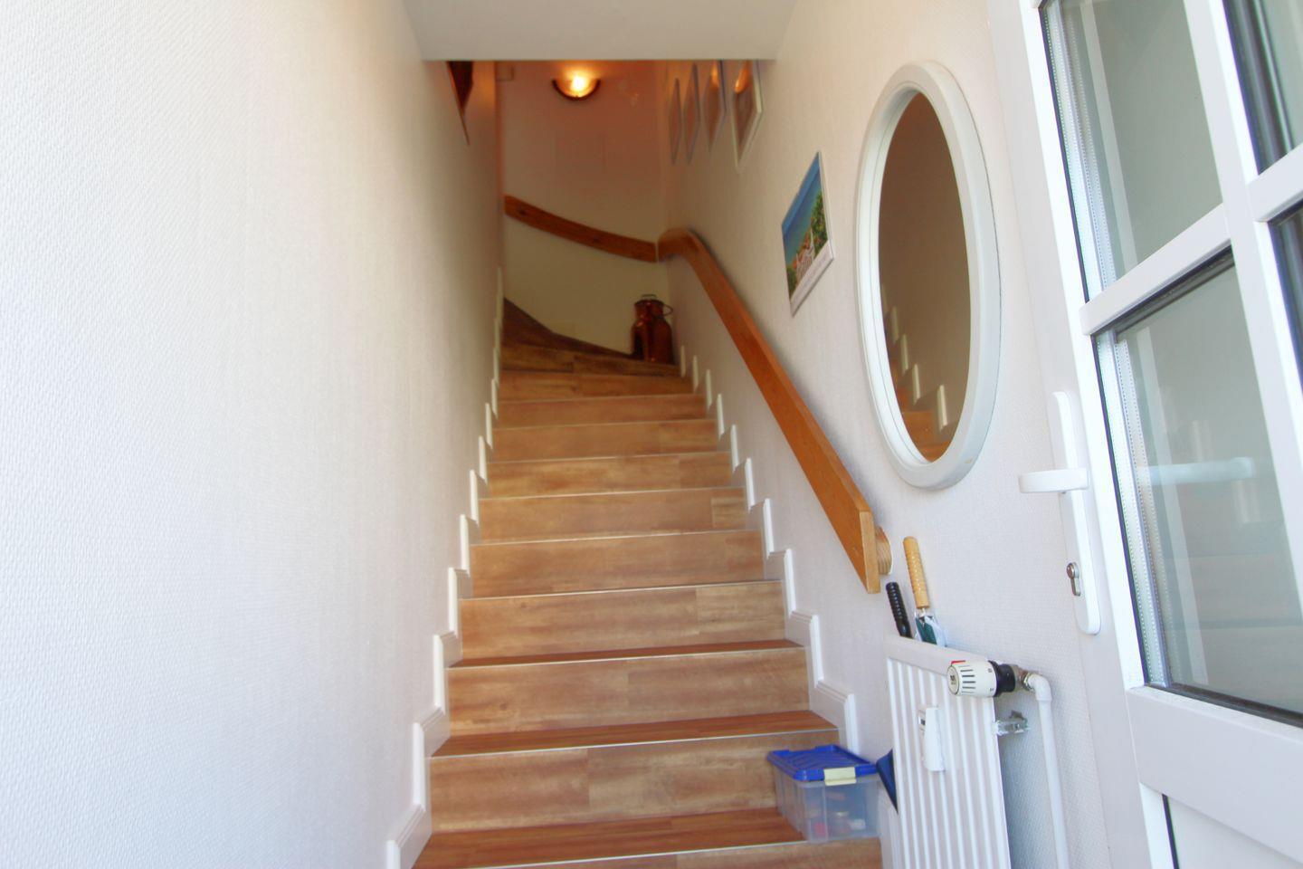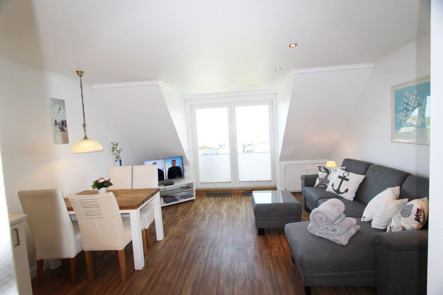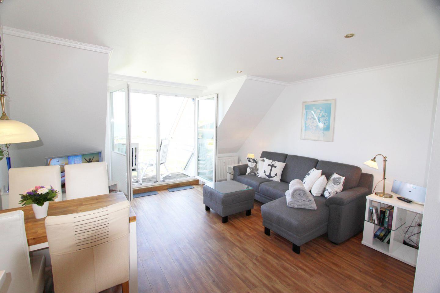 Der gemütliche Wohnbereich im Obergeschoss lädt mit einer bequemen Sitzecke zu Entspannung und Erholung ein. Highlight des Wohnbereiches ist der direkte Meerblick!