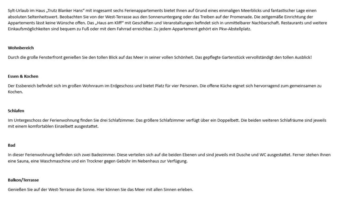 Sylt-Urlaub im Haus „Trutz Blanker Hans“ mit insgesamt sechs Ferienappartements bietet Ihnen auf Grund eines einmaligen Meerblicks und fantastischer Lage einen absoluten Seltenheitswert. Beobachten Sie von der West-Terrasse aus den Sonnenuntergang oder das Treiben auf der Promenade. Die zeitgemäße Einrichtung der Appartements lässt keine Wünsche offen. Das „Haus am Kliff“ mit Geschäften und Veranstaltungen befindet sich in unmittelbarer Nachbarschaft. Restaurants und weitere Einkaufsmöglichkeiten sind bequem zu Fuß oder mit dem Fahrrad erreichbar. Zu jedem Appartement gehört ein Pkw-Abstellplatz.
