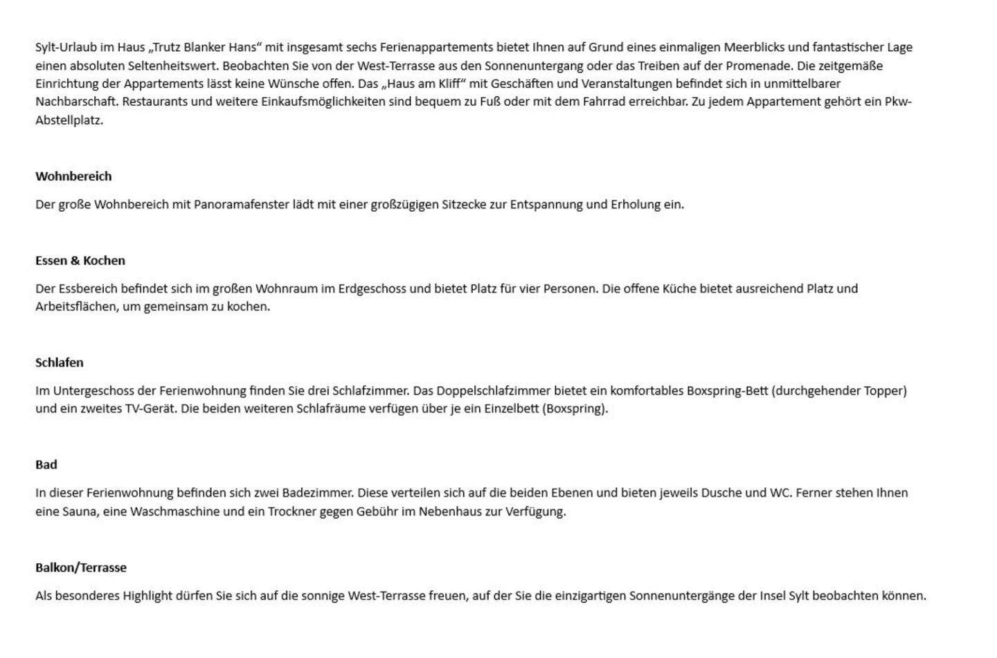 Sylt-Urlaub im Haus „Trutz Blanker Hans“ mit insgesamt sechs Ferienappartements bietet Ihnen auf Grund eines einmaligen Meerblicks und fantastischer Lage einen absoluten Seltenheitswert. Beobachten Sie von der West-Terrasse aus den Sonnenuntergang oder das Treiben auf der Promenade. Die zeitgemäße Einrichtung der Appartements lässt keine Wünsche offen. Das „Haus am Kliff“ mit Geschäften und Veranstaltungen befindet sich in unmittelbarer Nachbarschaft. Restaurants und weitere Einkaufsmöglichkeiten sind bequem zu Fuß oder mit dem Fahrrad erreichbar. Zu jedem Appartement gehört ein Pkw-Abstellplatz.