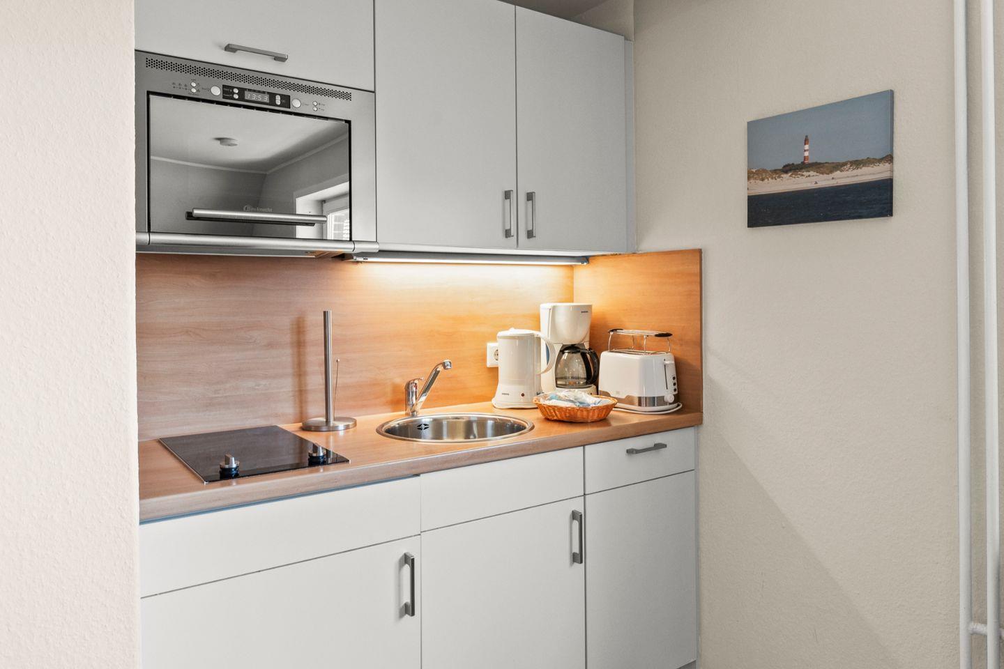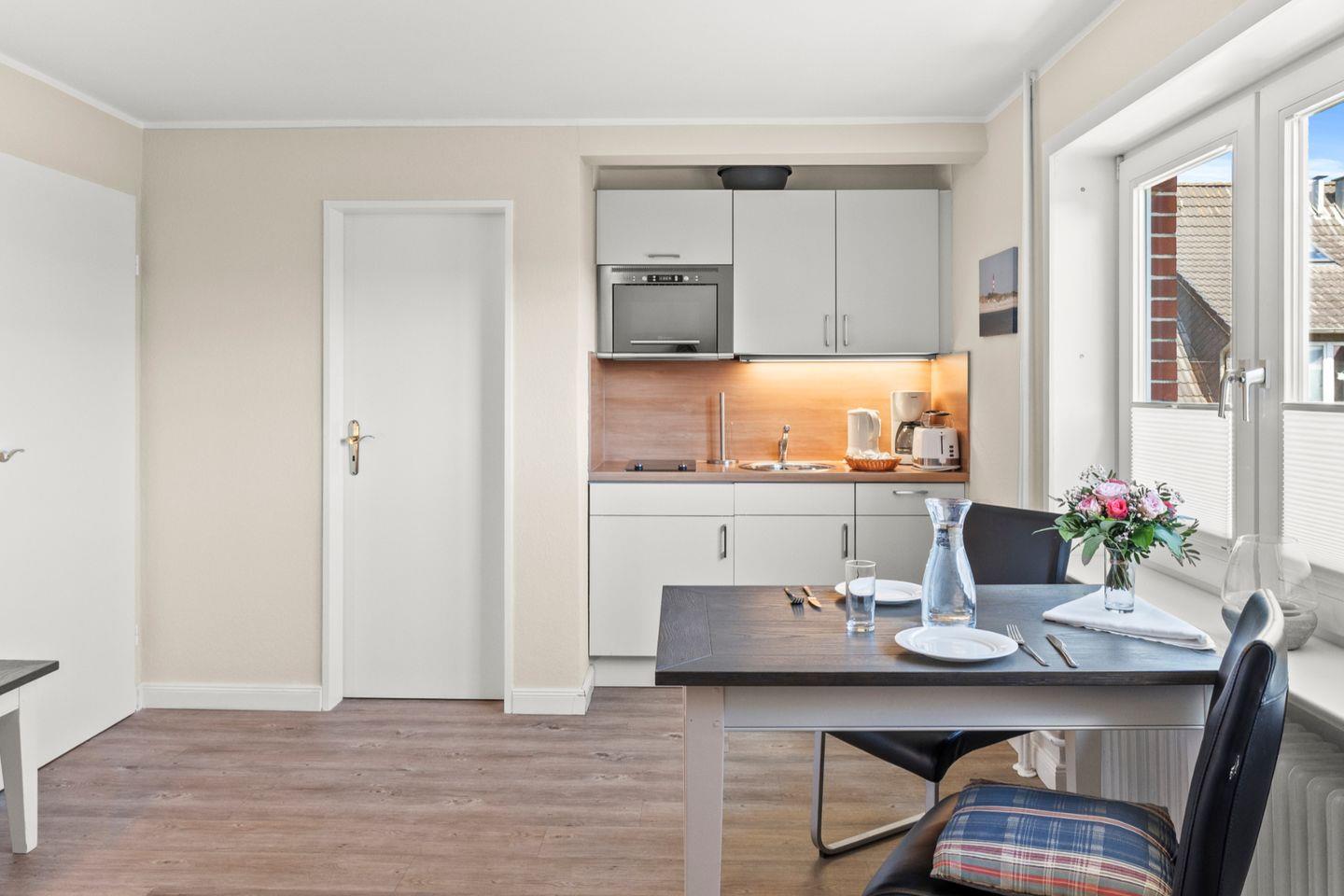In dem offenen Koch- und Essbereich mit seiner gut ausgestatteten Küchenzeile und dem kleinen Esstisch direkt am Fenster können Sie das Zubereiten und Genießen Ihrer Speisen voll auskosten.