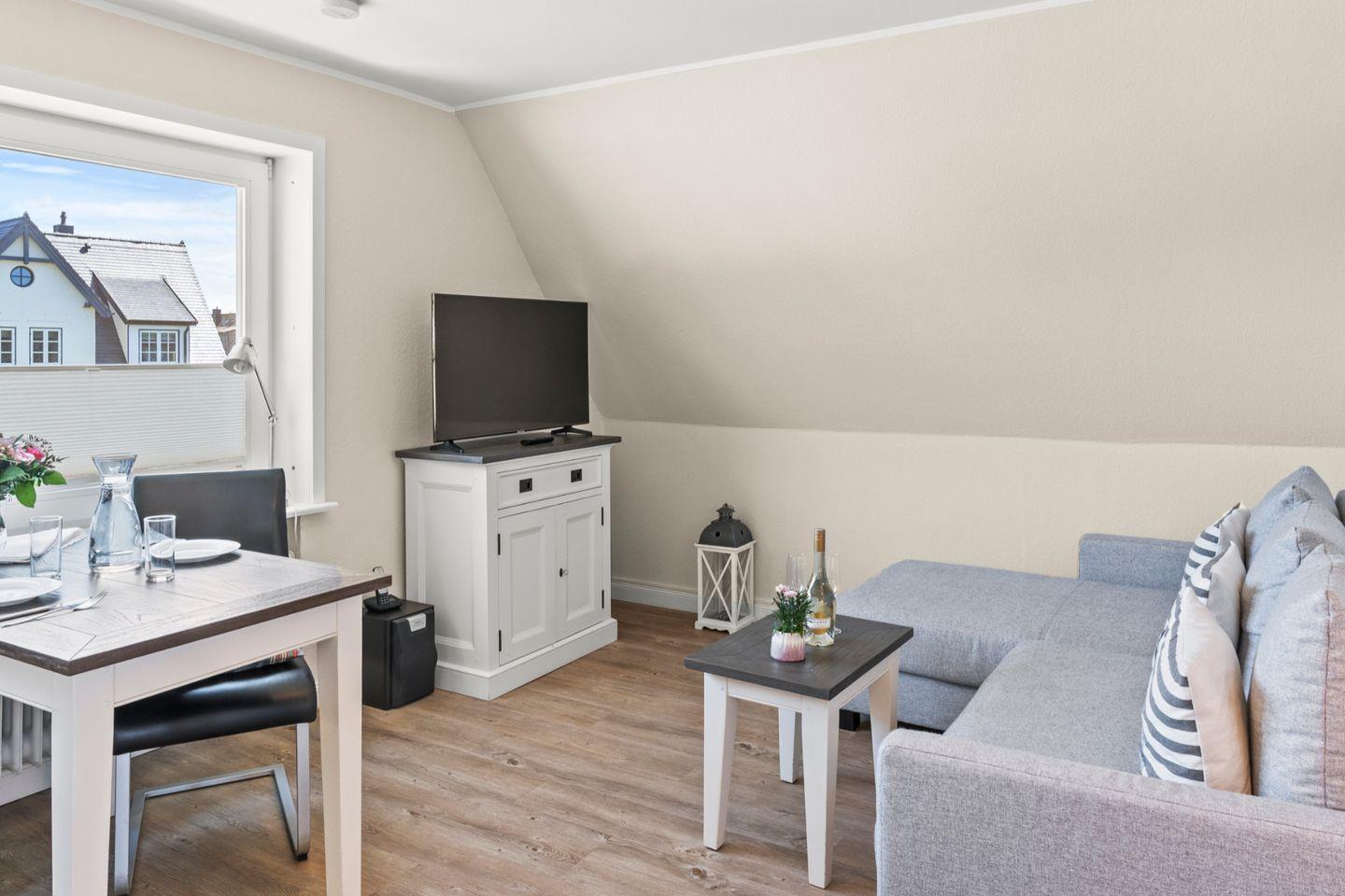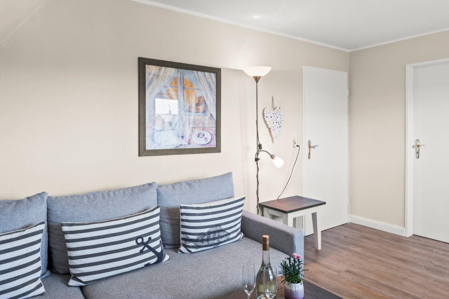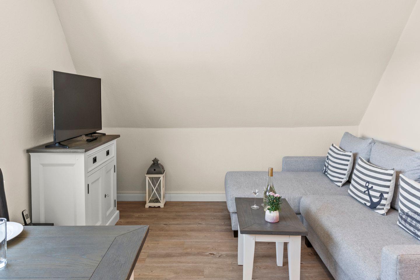 Der hell gestaltete, offene Wohnbereich im Obergeschoss mit komfortabler technischer Ausstattung und einer gemütlichen Sofagarnitur lädt zum Verweilen ein.
