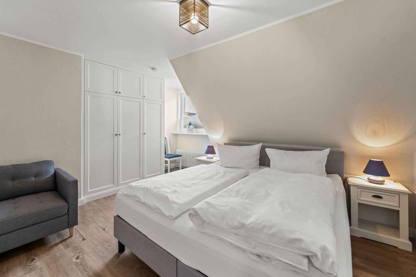 Der separate Schlafraum bietet Ihnen ein komfortables Boxspring-Bett mit durchgehendem Topper und der geräumige Kleiderschrank verschafft Ihnen reichlich Stauraum.