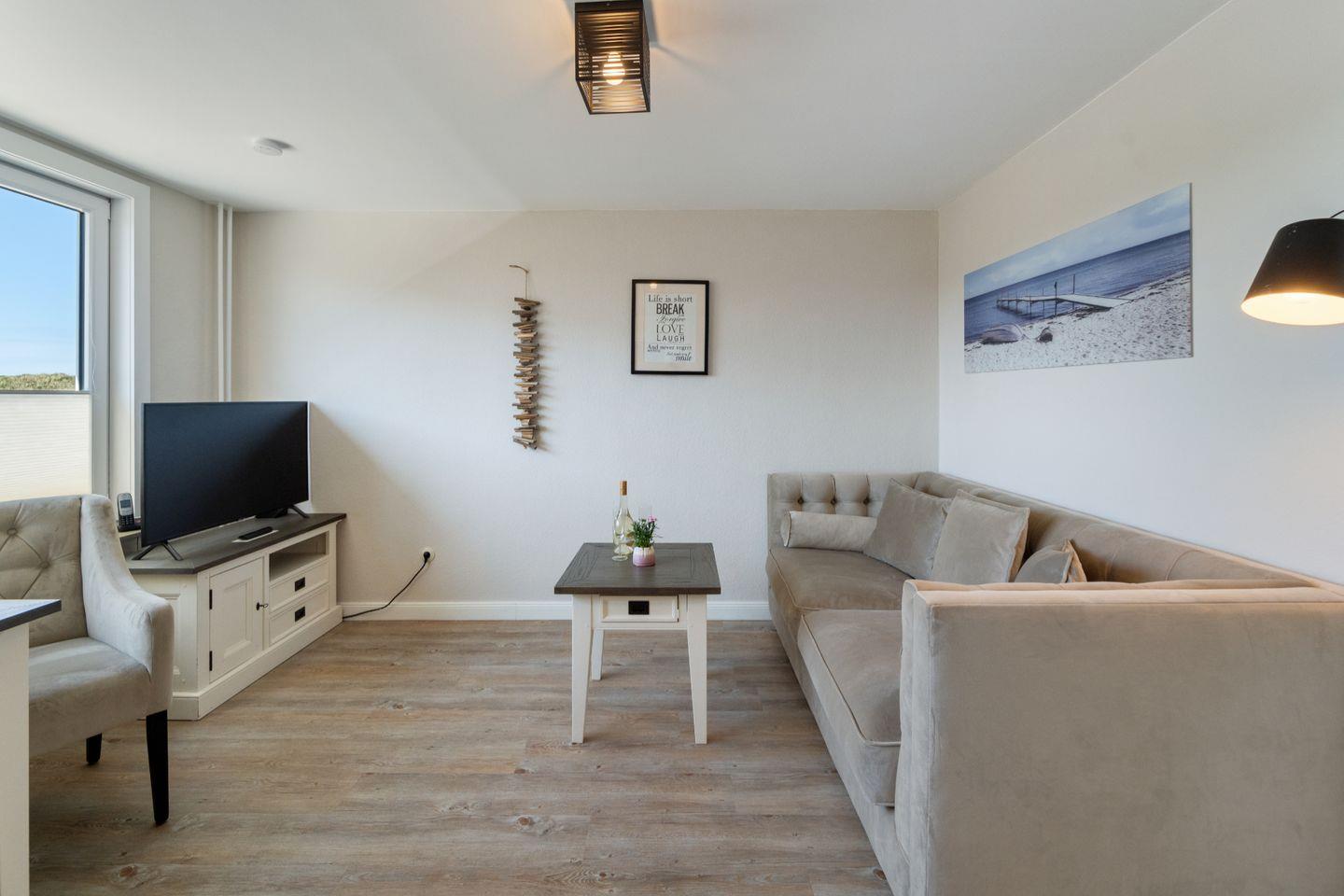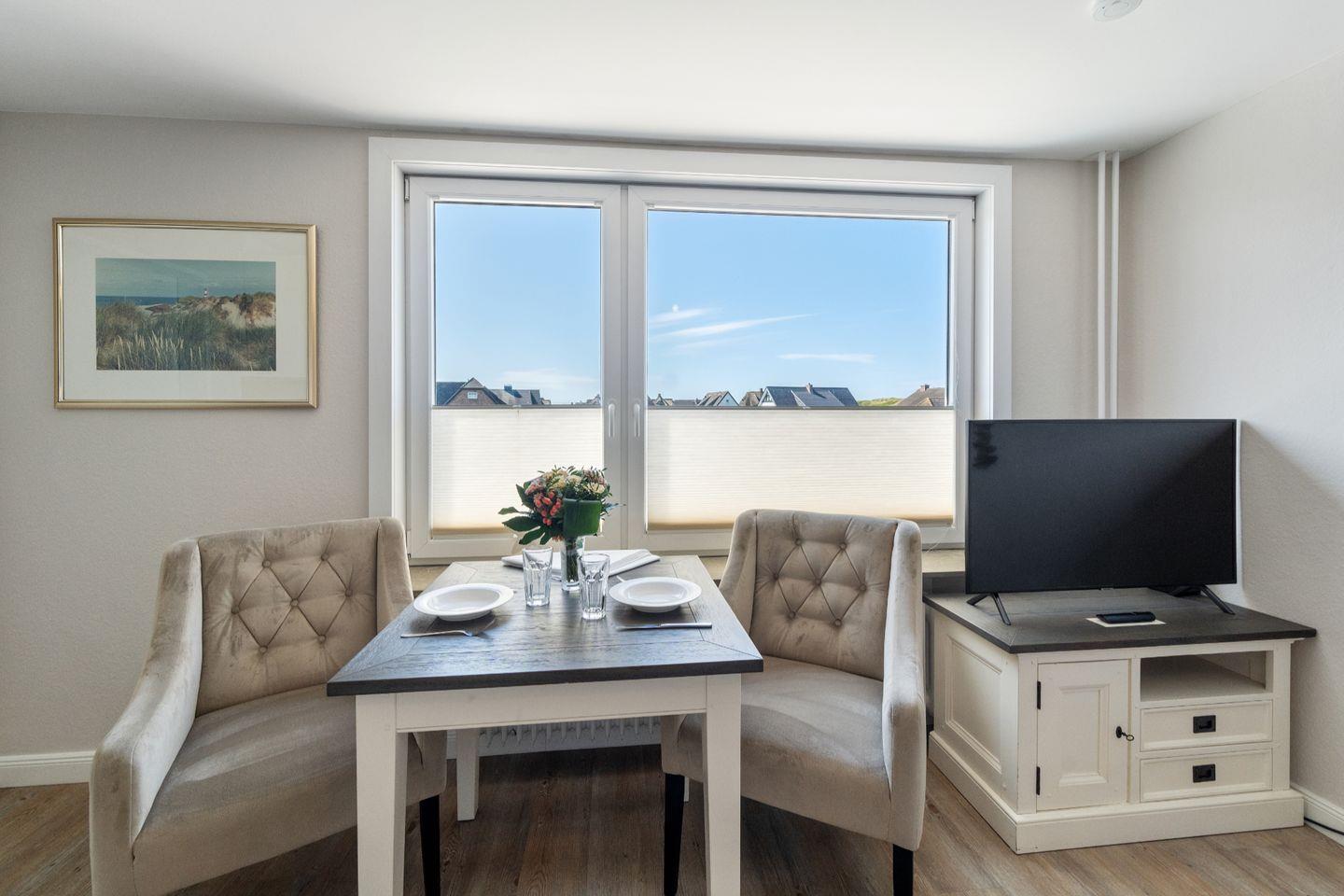 Der offene Wohn-Essbereich im Obergeschoss ist mit seinen maritimen Details ein perfekter Wohlfühlbereich im erholsamen Urlaub auf Sylt. Hier können Sie den Tag entspannt vor dem TV oder bei angenehmer Musik genießen.