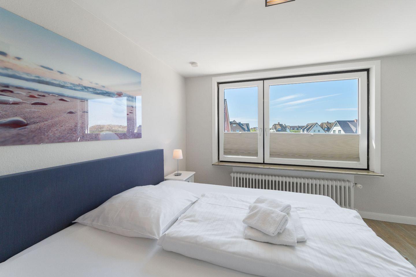 In dem nach Süden gelegenen Doppelschlafzimmer können Sie schon am Morgen die aufgehende Sonne in Ihren Tag lassen. Der geräumige Kleiderschrank bietet genug Stauraum für einen unbeschwerten Inselurlaub.