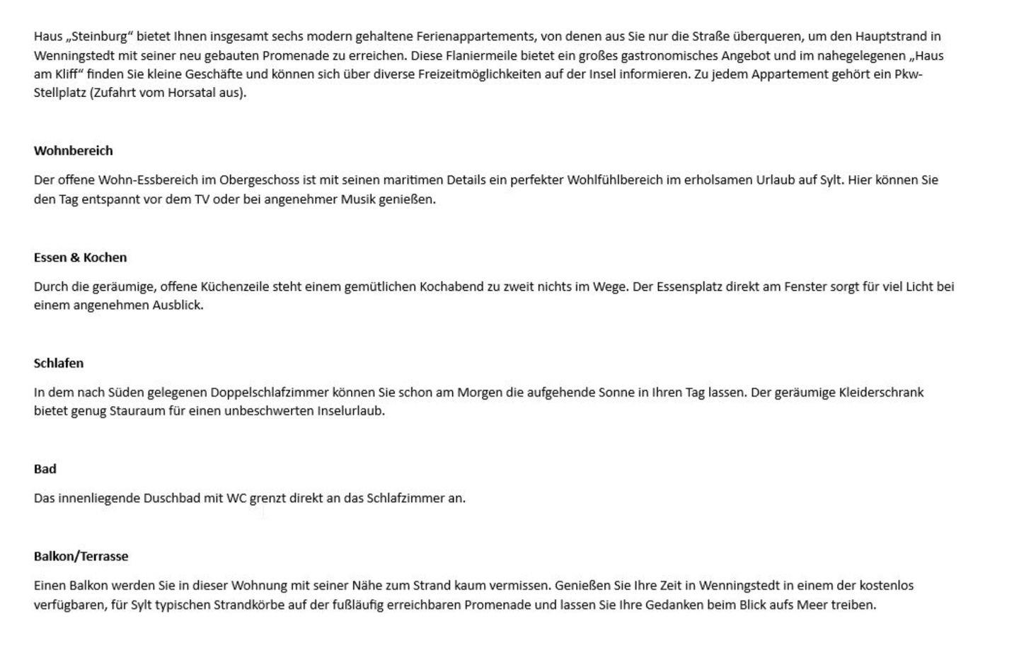 Haus „Steinburg“ bietet Ihnen insgesamt sechs modern gehaltene Ferienappartements, von denen aus Sie nur die Straße überqueren, um den Hauptstrand in Wenningstedt mit seiner neu gebauten Promenade zu erreichen. Diese Flaniermeile bietet ein großes gastronomisches Angebot und im nahegelegenen „Haus am Kliff“ finden Sie kleine Geschäfte und können sich über diverse Freizeitmöglichkeiten auf der Insel informieren. Zu jedem Appartement gehört ein Pkw-Stellplatz (Zufahrt vom Horsatal aus). Ab 2026 sind leider keine Haustiere mehr erlaubt.
