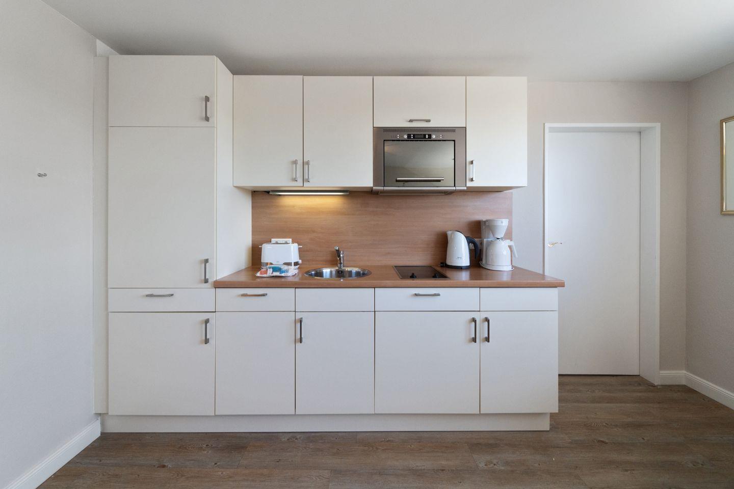 Durch die geräumige, offene Küchenzeile steht einem gemütlichen Kochabend zu zweit nichts im Wege. Der Essensplatz direkt am Fenster sorgt für viel Licht bei einem angenehmen Ausblick.