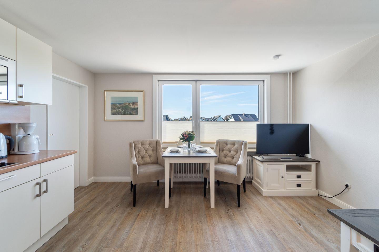 Fantastisch gelegenes Feriendomizil im Herzen Wenningstedts. Die schöne Zwei-Zimmer-Wohnung auf einer Ebene lädt mit ihrer hervorragenden Lage zum entspannten Strandurlaub auf Sylt ein. Ab 2026 sind leider keine Haustiere mehr erlaubt.