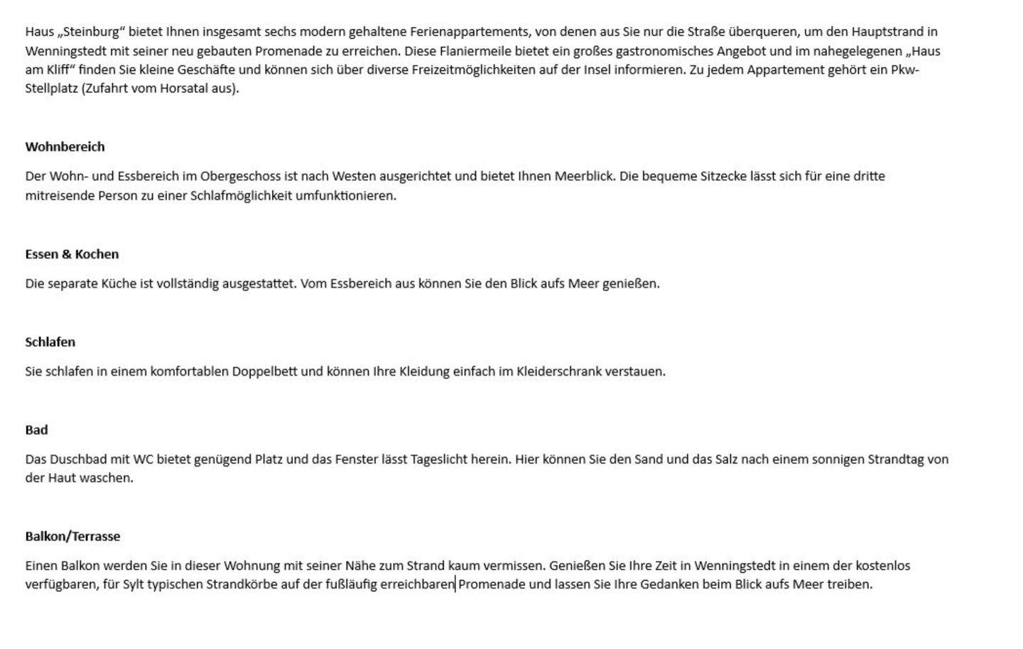 Haus „Steinburg“ bietet Ihnen insgesamt sechs modern gehaltene Ferienappartements, von denen aus Sie nur die Straße überqueren, um den Hauptstrand in Wenningstedt mit seiner neu gebauten Promenade zu erreichen. Diese Flaniermeile bietet ein großes gastronomisches Angebot und im nahegelegenen „Haus am Kliff“ finden Sie kleine Geschäfte und können sich über diverse Freizeitmöglichkeiten auf der Insel informieren. Zu jedem Appartement gehört ein Pkw-Stellplatz (Zufahrt vom Horsatal aus). Ab 2026 sind leider keine Haustiere mehr erlaubt.