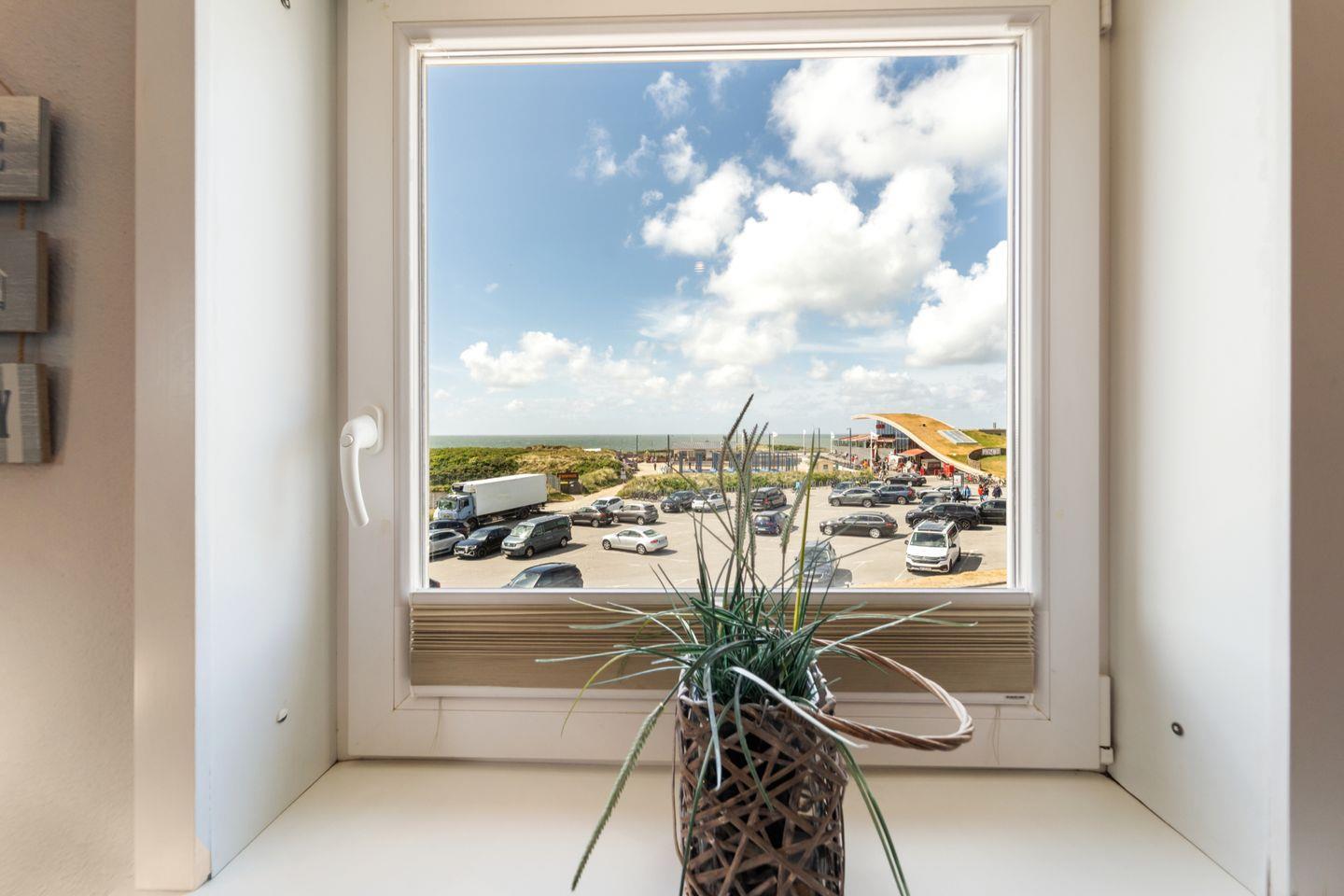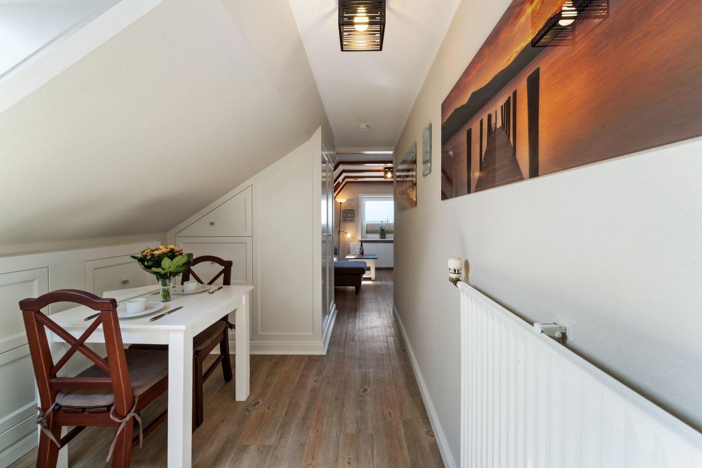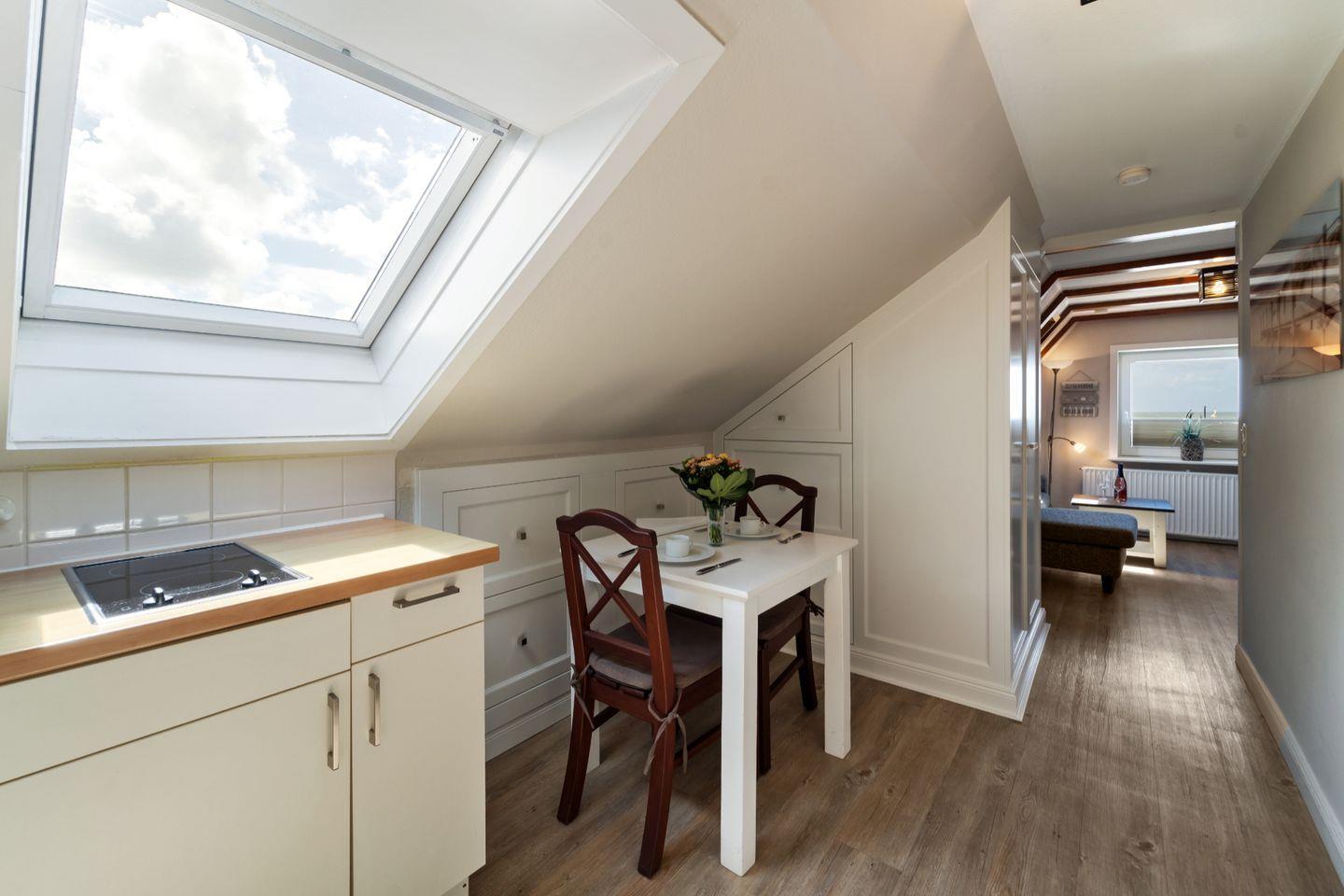 Der gemütliche Wohnbereich im Dachgeschoss mit rustikaler Balkenoptik lädt mit einer bequemen Sitzecke zu Entspannung und Erholung ein. Das nach Westen gerichtete Fenster bietet Ihnen Blick aufs Meer.