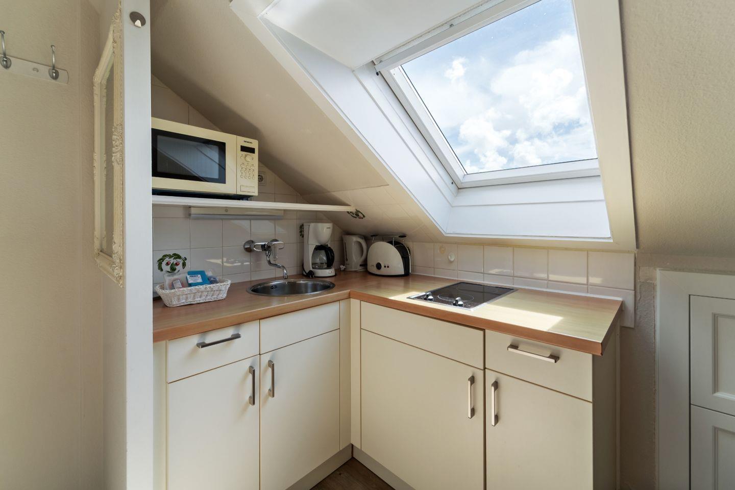 Die Eck-Küchenzeile mit angrenzendem Essensplatz lädt zum gemütlichen Kochen zu zweit ein. Die Wandbilder mit Landschaftsdarstellungen der Insel Sylt schaffen ein angenehmes Urlaubsfeeling.