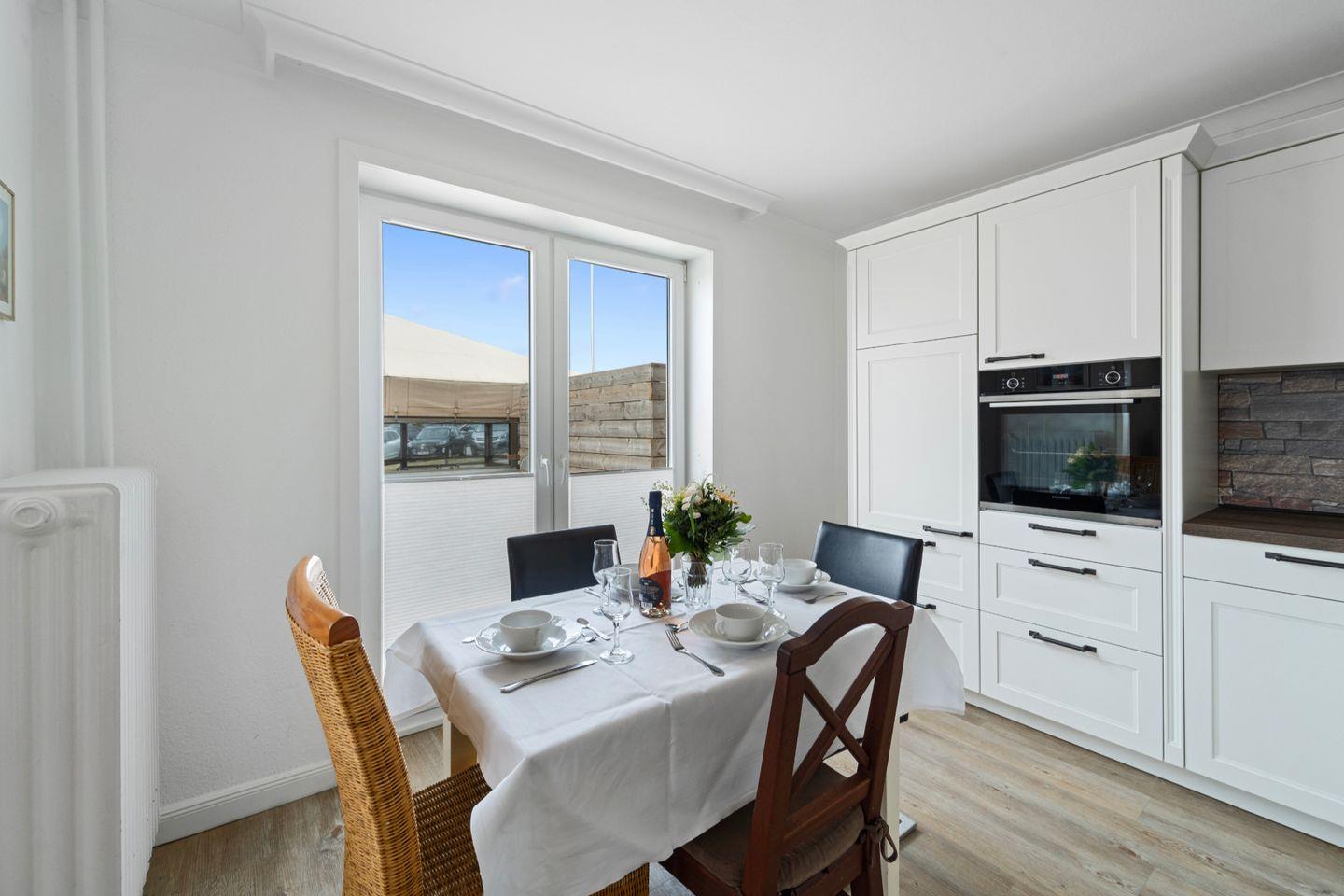 Die helle Küche bietet ausreichend Platz und Arbeitsflächen, um gemeinsam zu kochen. Der Esstisch lädt bis zu vier Personen zum gemeinsamen Speisen ein.