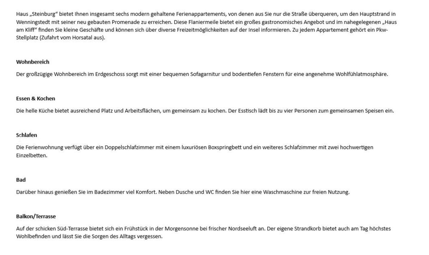 Haus „Steinburg“ bietet Ihnen insgesamt sechs modern gehaltene Ferienappartements, von denen aus Sie nur die Straße überqueren, um den Hauptstrand in Wenningstedt mit seiner neu gebauten Promenade zu erreichen. Diese Flaniermeile bietet ein großes gastronomisches Angebot und im nahegelegenen „Haus am Kliff“ finden Sie kleine Geschäfte und können sich über diverse Freizeitmöglichkeiten auf der Insel informieren. Zu jedem Appartement gehört ein Pkw-Stellplatz (Zufahrt vom Horsatal aus). Ab 2026 sind leider keine Haustiere mehr erlaubt.