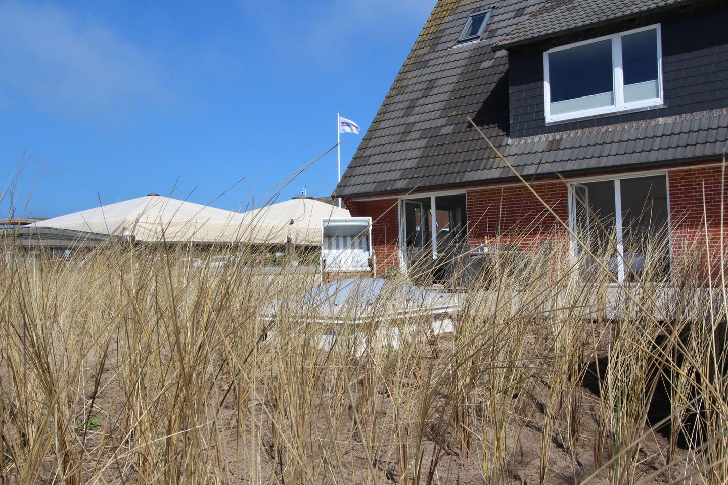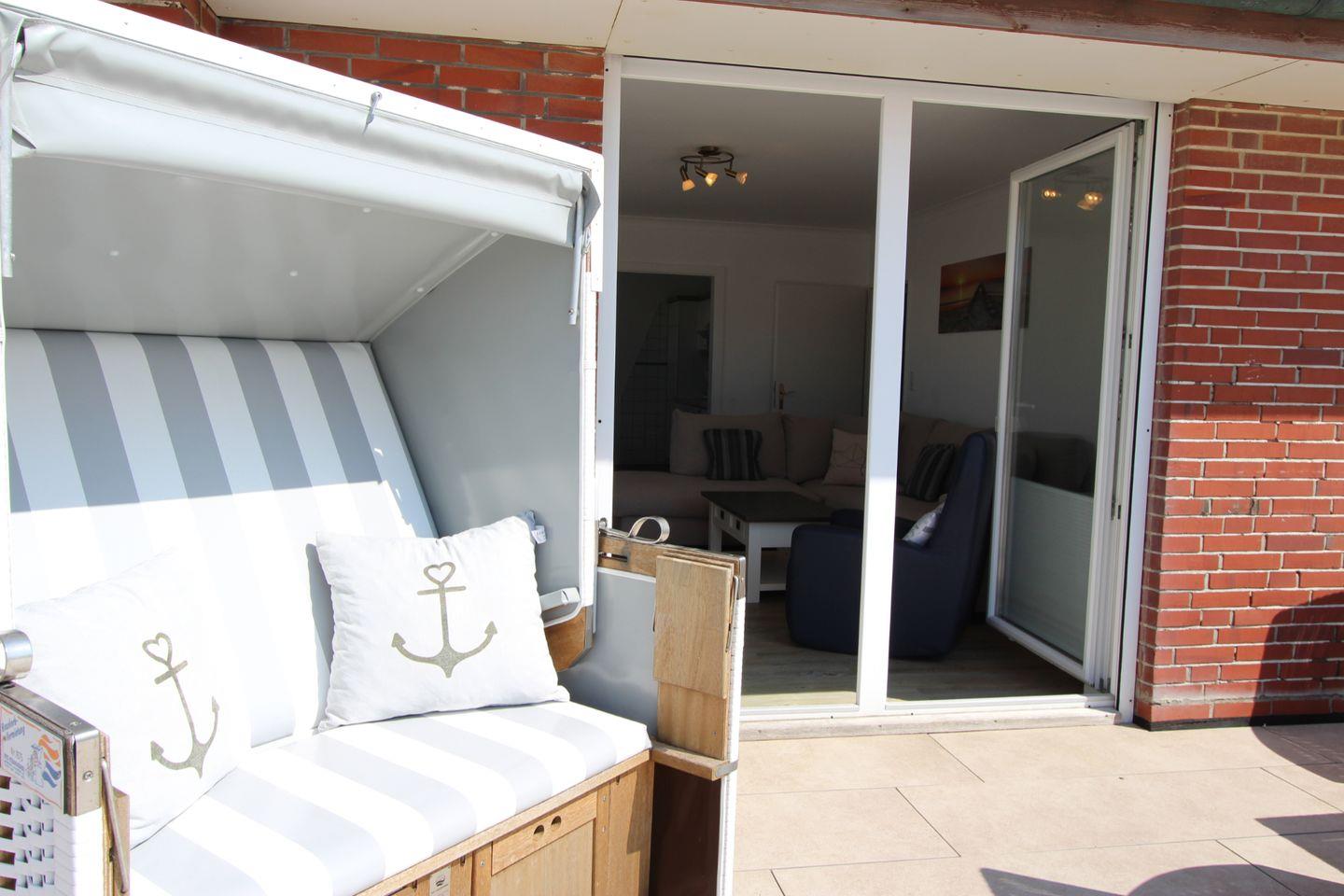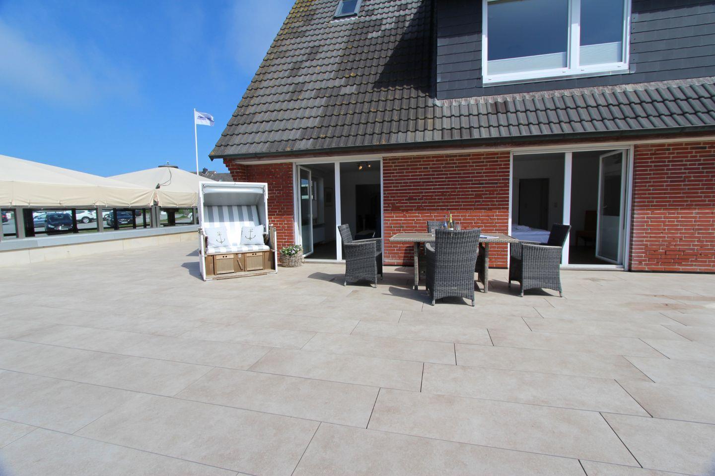 Auf der schicken Süd-Terrasse bietet sich ein Frühstück in der Morgensonne bei frischer Nordseeluft an. Der eigene Strandkorb bietet auch am Tag höchstes Wohlbefinden und lässt Sie die Sorgen des Alltags vergessen.