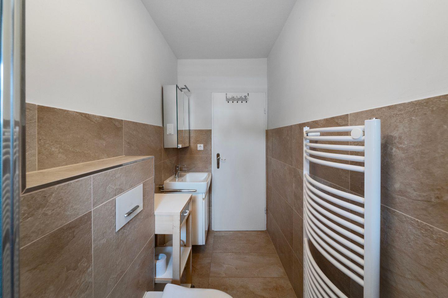 Das Duschbad mit WC bietet genügend Platz und das Fenster lässt Tageslicht herein. Hier können Sie den Sand und das Salz nach einem sonnigen Strandtag von der Haut waschen.