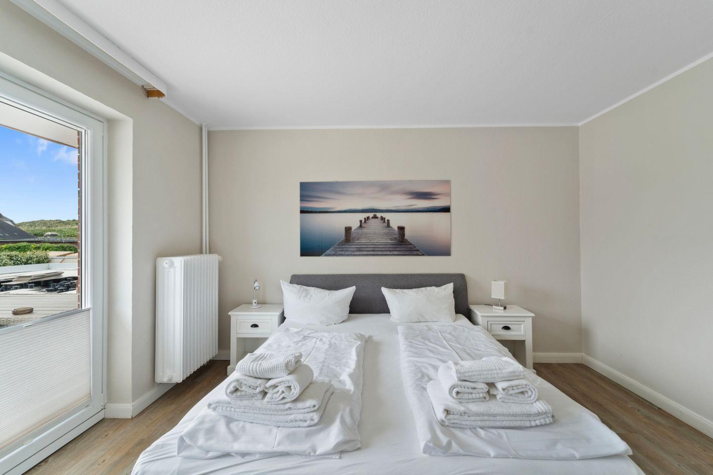 Die Ferienwohnung verfügt über ein Doppelschlafzimmer mit einem luxuriösen Boxspringbett mit durchgehender Matratze und ein weiteres Schlafzimmer mit zwei hochwertigen Einzelbetten.