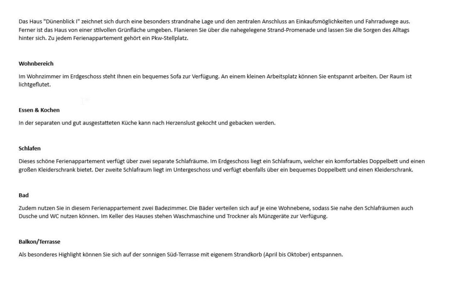 Das Haus "Dünenblick I" zeichnet sich durch eine besonders strandnahe Lage und den zentralen Anschluss an Einkaufsmöglichkeiten und Fahrradwege aus. Ferner ist das Haus von einer stilvollen Grünfläche umgeben. Flanieren Sie über die nahegelegene Strand-Promenade und lassen Sie die Sorgen des Alltags hinter sich. Zu jedem Ferienappartement gehört ein Pkw-Stellplatz.