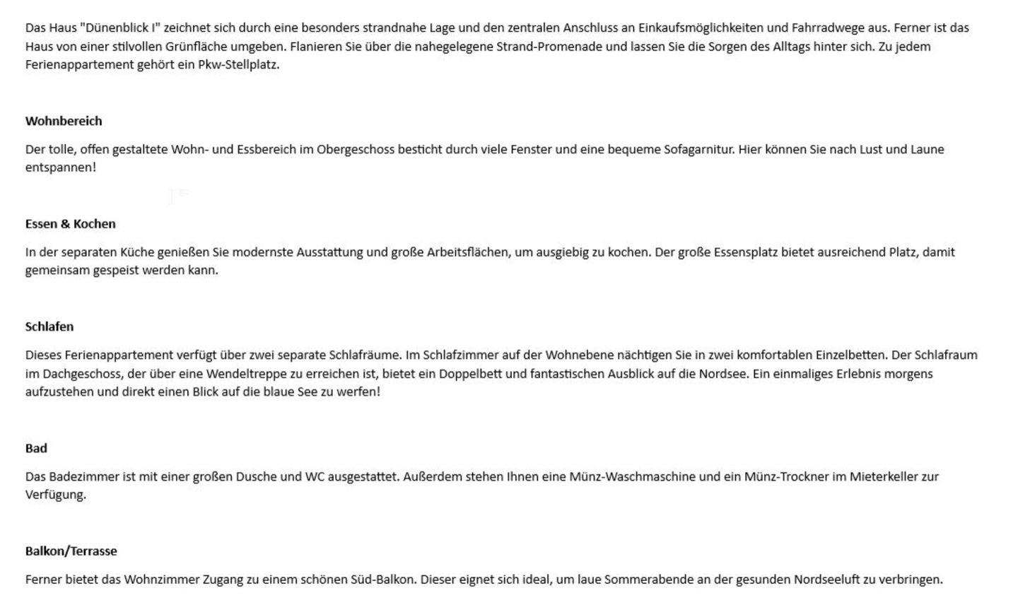 Sehr geräumige Drei-Zimmer-Wohnung in strandnaher Top-Lage! Durch die lichtdurchfluteten Zimmer verspricht diese Ferienwohnung ein tolles Ambiente. Vom Schlafzimmer im Dachgeschoss aus genießen Sie einen fantastischen Meerblick.