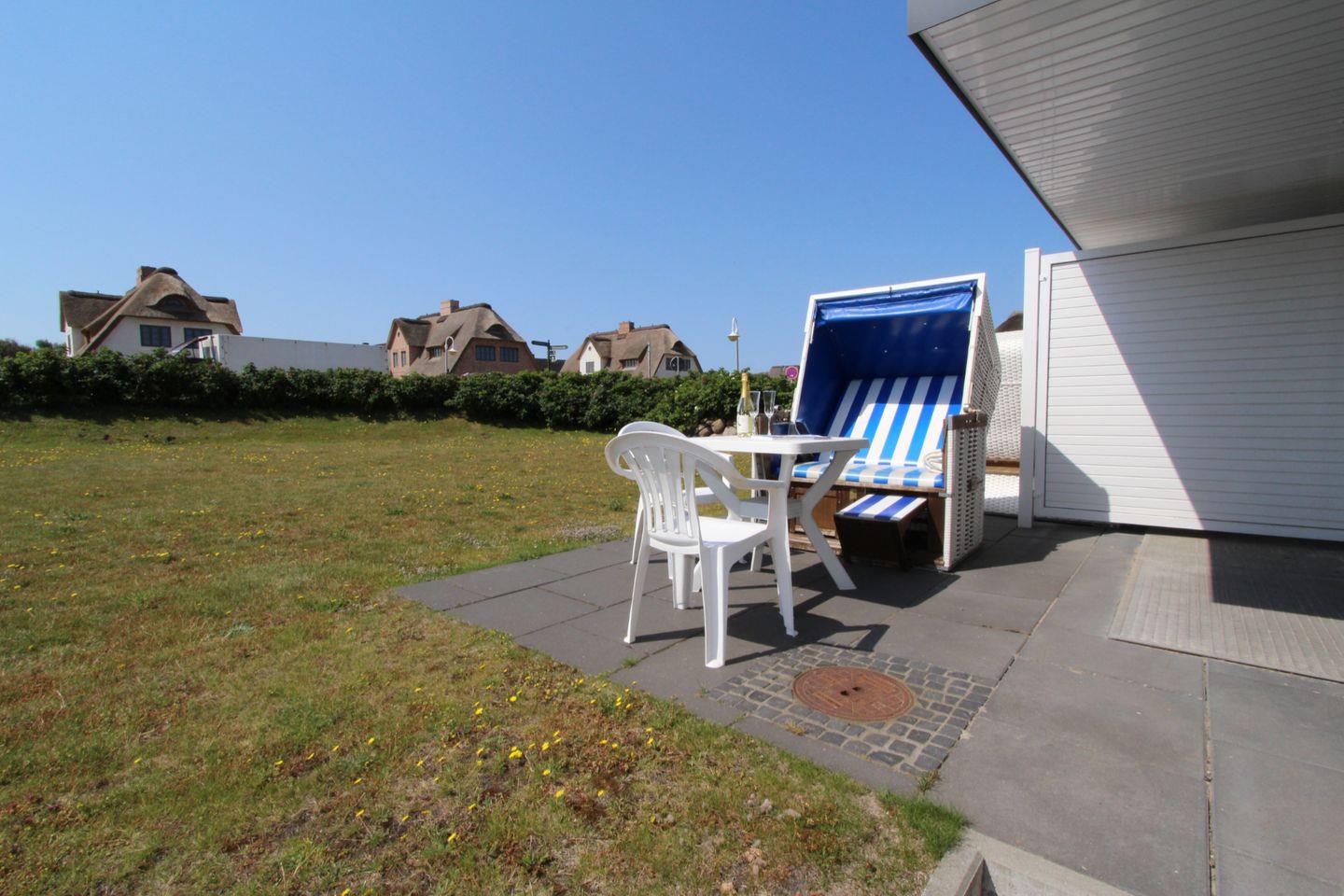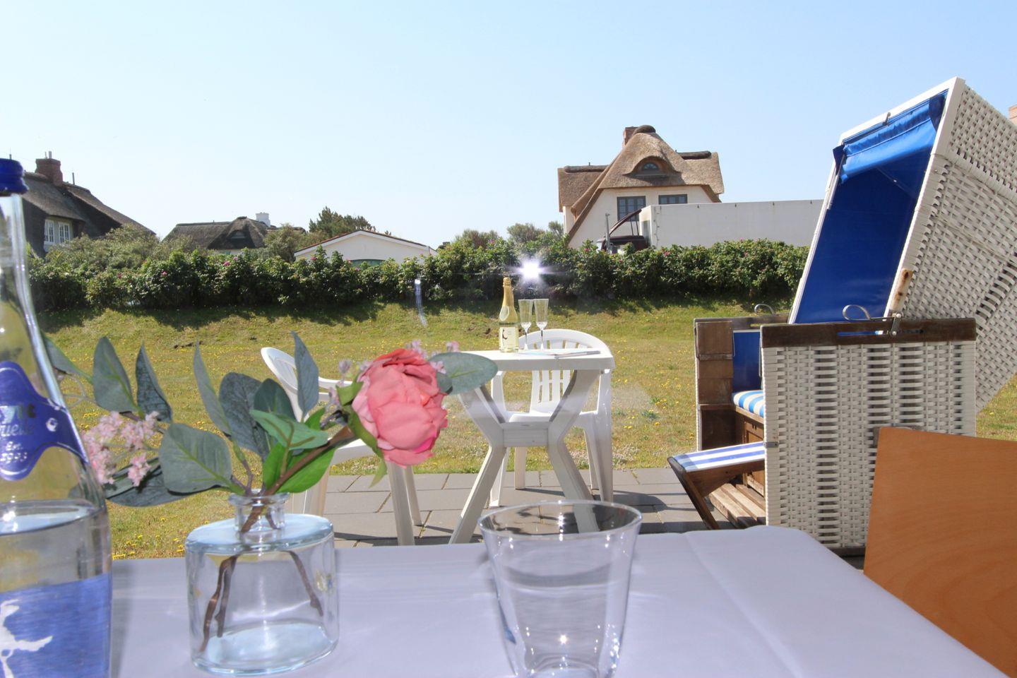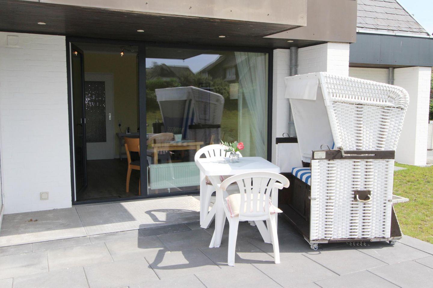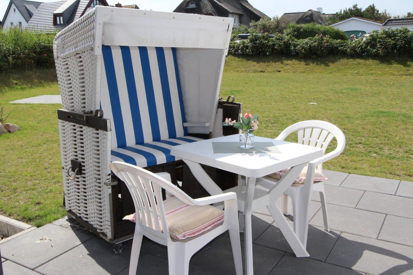 Als besonderes Highlight dieser Ferienwohnung steht eine Süd-Terrasse mit eigenem Strandkorb (April bis Oktober) zur freien Nutzung bereit. Sonnen Sie sich hier bei gutem Wetter und erholen Sie sich von den Sorgen des Alltags.