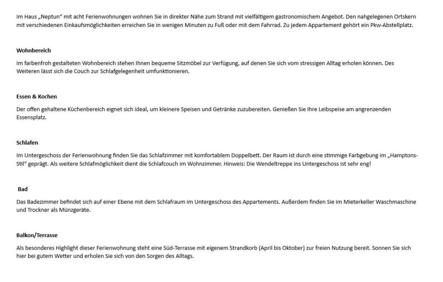 Im Haus „Neptun“ mit acht Ferienwohnungen wohnen Sie in direkter Nähe zum Strand mit vielfältigem gastronomischem Angebot. Den nahgelegenen Ortskern mit verschiedenen Einkaufsmöglichkeiten erreichen Sie in wenigen Minuten zu Fuß oder mit dem Fahrrad. Zu jedem Appartement gehört ein Pkw-Abstellplatz.