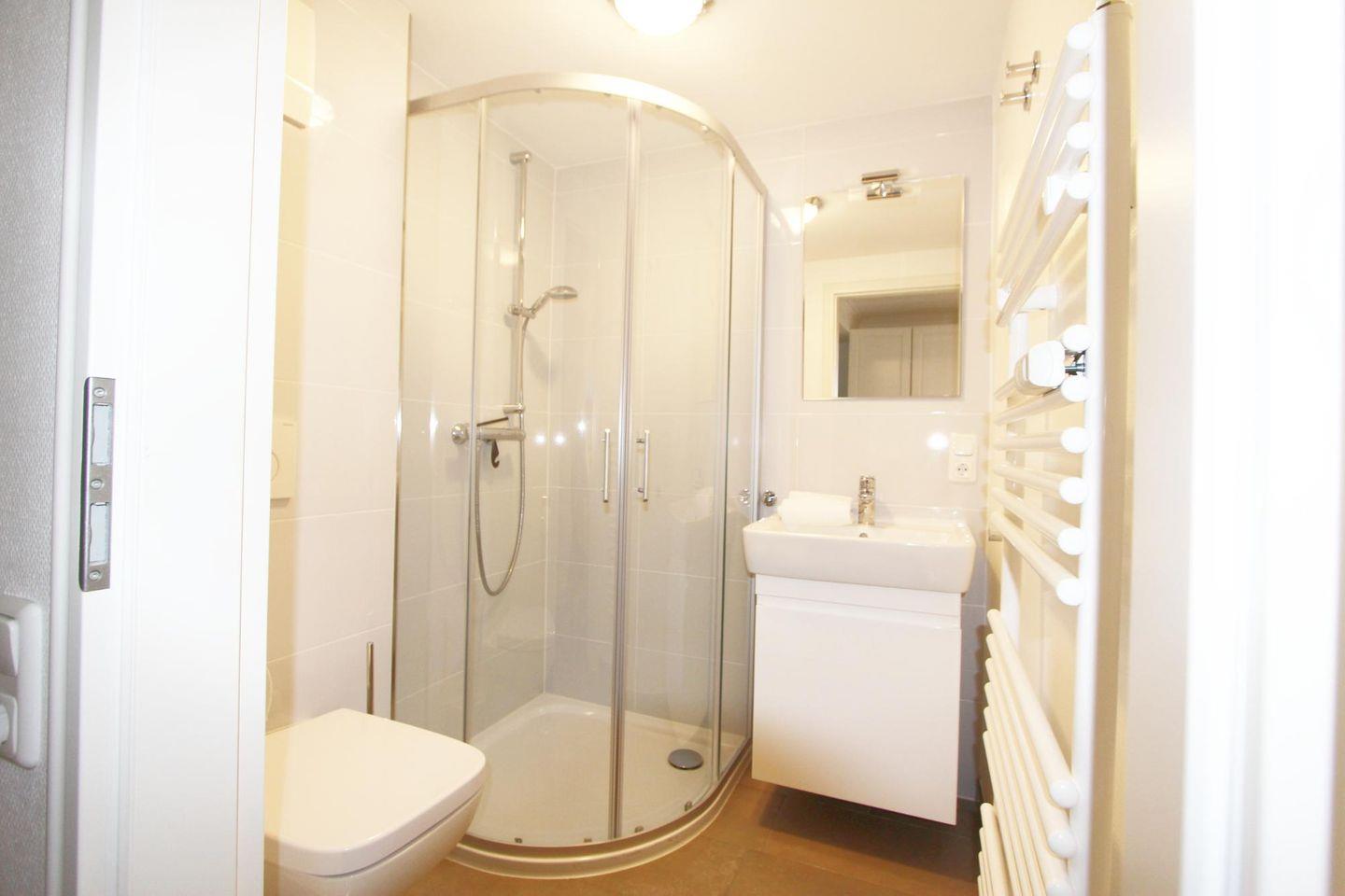 Das Badezimmer befindet sich auf einer Ebene mit dem Schlafraum im Untergeschoss des Appartements. Außerdem finden Sie im Mieterkeller Waschmaschine und Trockner als Münzgeräte.