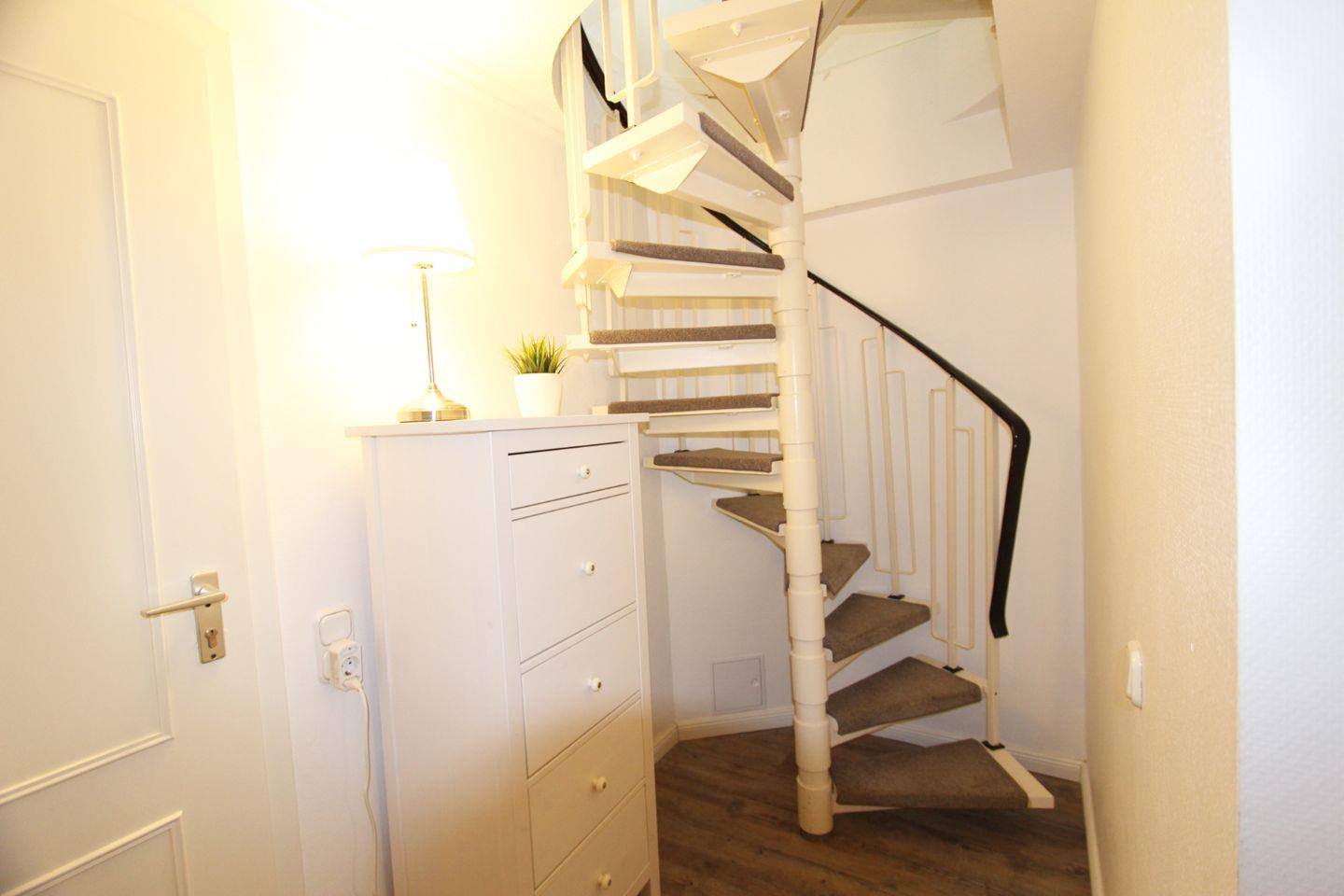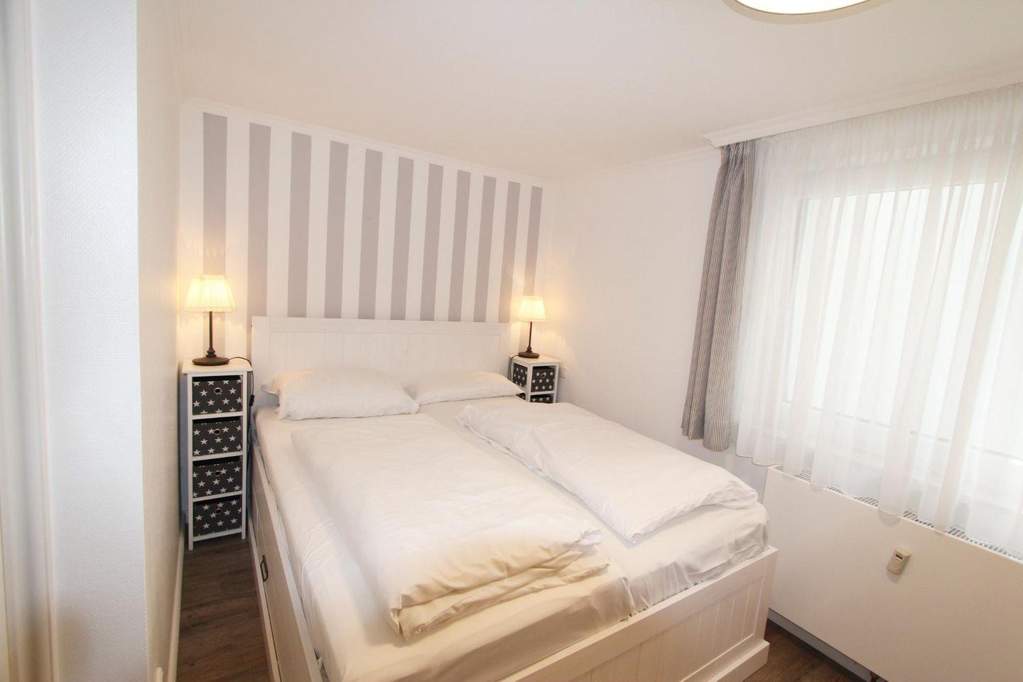 Im Untergeschoss der Ferienwohnung finden Sie das Schlafzimmer mit komfortablem Doppelbett. Der Raum ist durch eine stimmige Farbgebung im „Hamptons-Stil“ geprägt. Als weitere Schlafmöglichkeit dient die Schlafcouch im Wohnzimmer. Hinweis: Die Wendeltreppe ins Untergeschoss ist sehr eng!