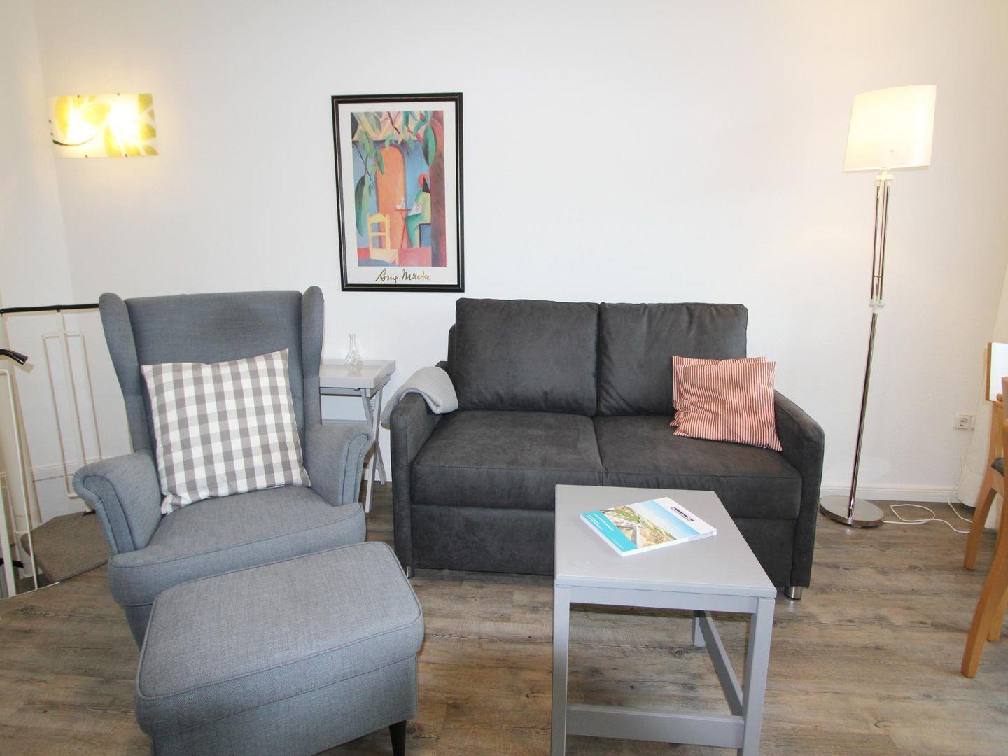 Im farbenfroh gestalteten Wohnbereich stehen Ihnen bequeme Sitzmöbel zur Verfügung, auf denen Sie sich vom stressigen Alltag erholen können. Des Weiteren lässt sich die Couch zur Schlafgelegenheit umfunktionieren.