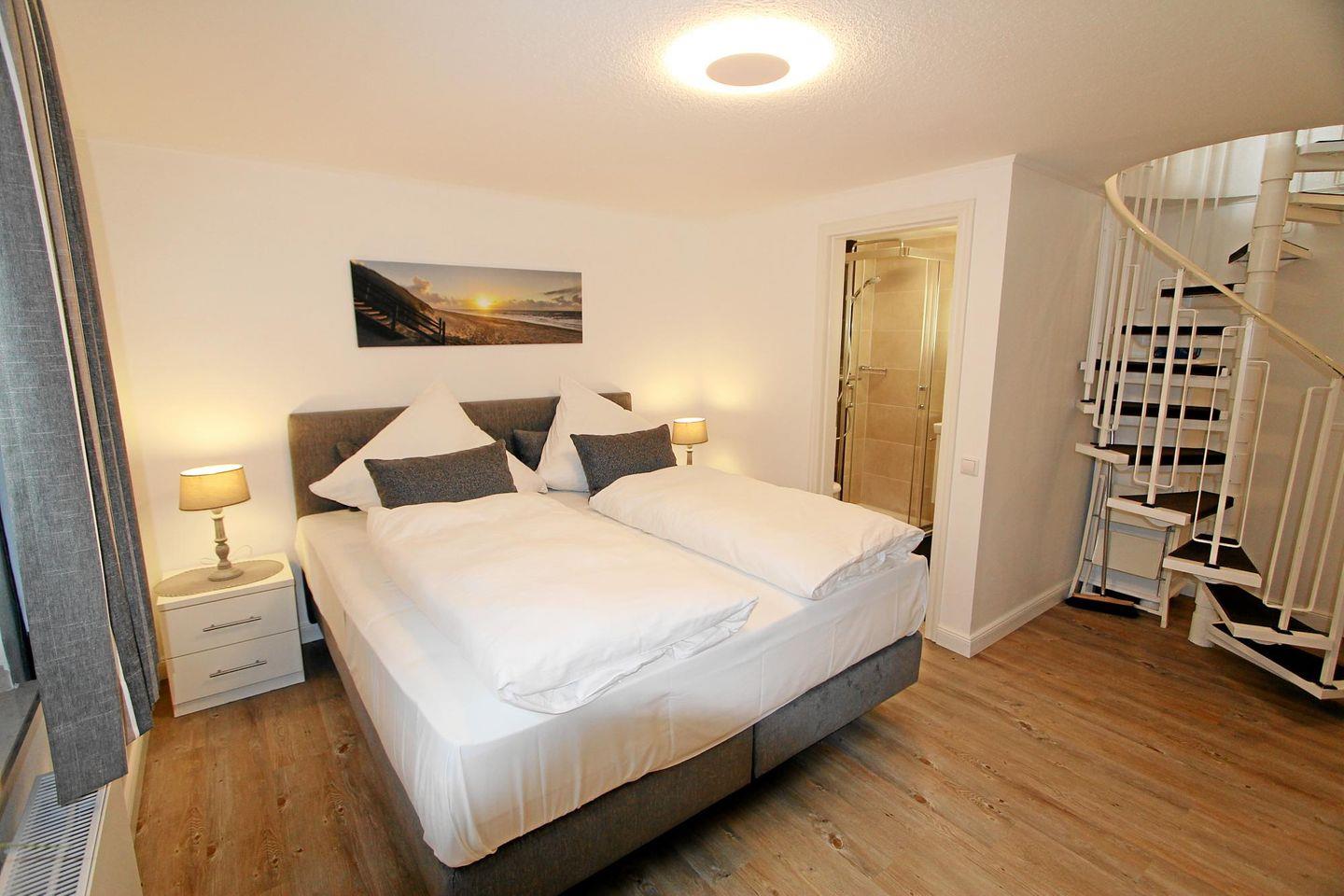 Im Untergeschoss der Ferienwohnung befindet sich der großzügige Schlafraum mit angrenzendem Duschbad/WC. Besonders komfortabel schlafen Sie hier auf einem breiten Boxspring-Bett mit durchgehender Matratze und bequemem Topper. Hinweis: Die Wendeltreppe ins Untergeschoss ist sehr eng!