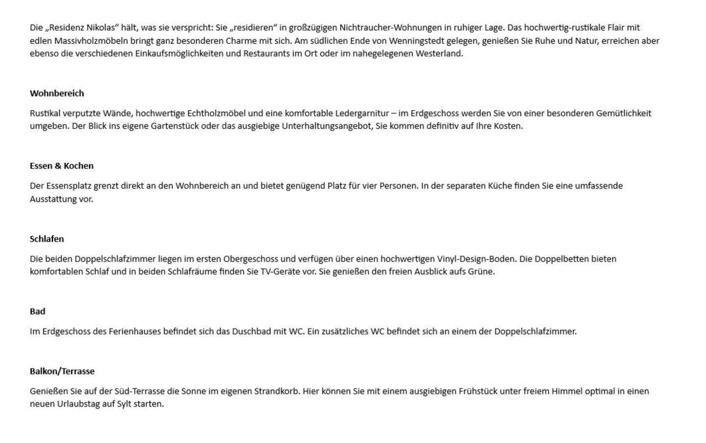 Die „Residenz Nikolas“ hält, was sie verspricht: Sie „residieren“ in großzügigen Nichtraucher-Wohnungen in ruhiger Lage. Das hochwertig-rustikale Flair mit edlen Massivholzmöbeln bringt ganz besonderen Charme mit sich. Am südlichen Ende von Wenningstedt gelegen, genießen Sie Ruhe und Natur, erreichen aber ebenso die verschiedenen Einkaufsmöglichkeiten und Restaurants im Ort oder im nahegelegenen Westerland.