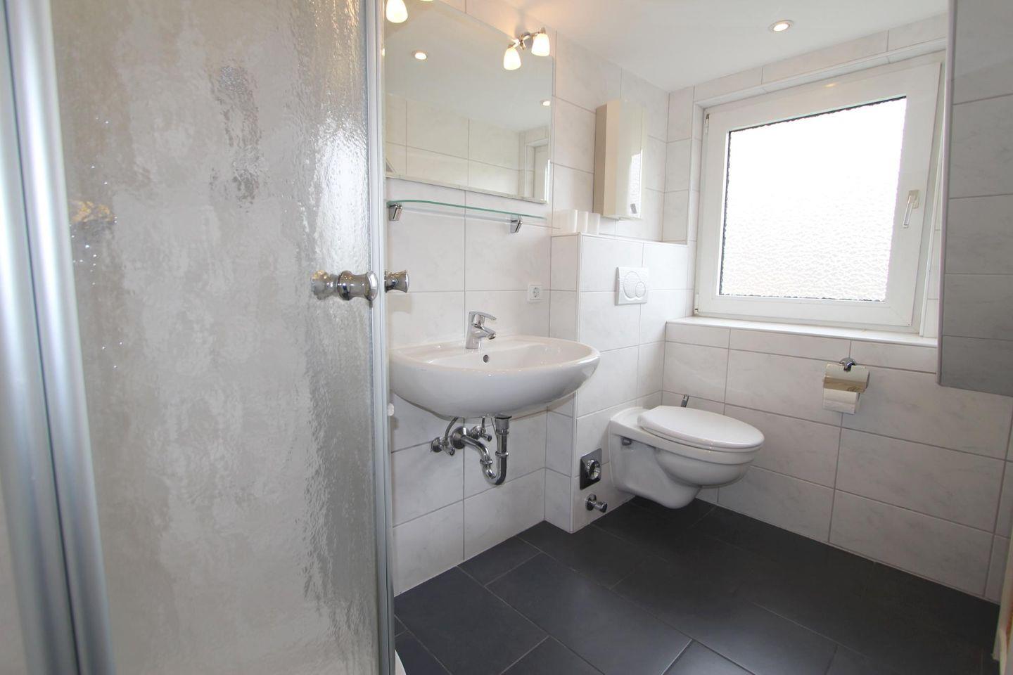Sie finden ein vollwertiges Duschbad mit WC im Obergeschoss auf einer Ebene mit dem Wohn- und Essbereich. Waschmaschine und Trockner stehen im Mieterkeller als Münzgeräte zur Verfügung.