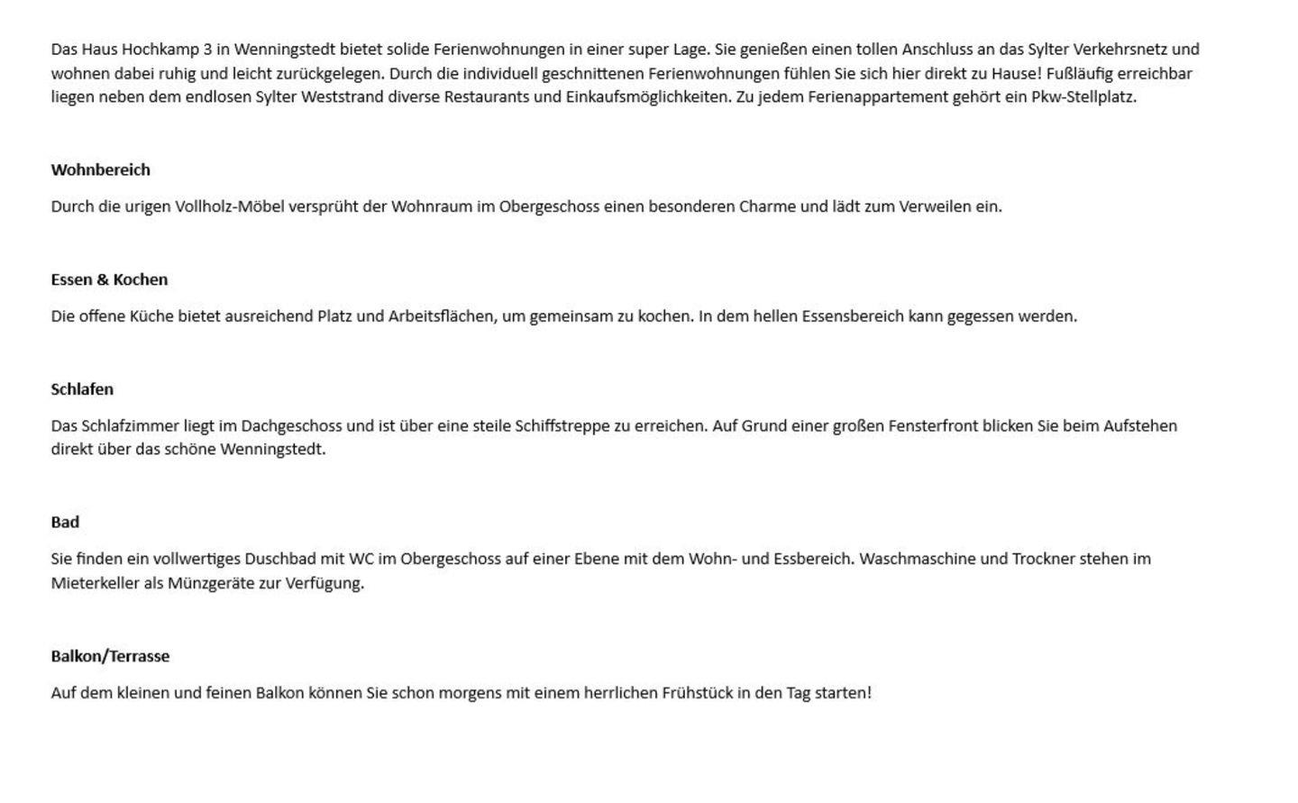 Gemütlich eingerichtetes Ferienappartement auf zwei Ebenen im Ober- und Dachgeschoss einer gepflegten Anlage. Hier stellt sich direkt ein heimeliges Gefühl ein, sodass Sie entspannt in den Urlaub starten können. Tolles Domizil für maximal drei Personen.