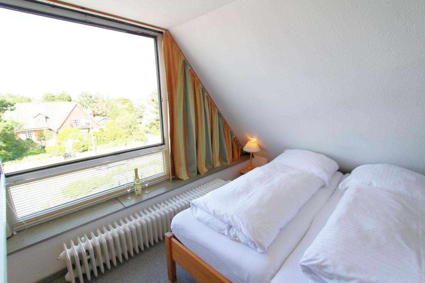Das Schlafzimmer liegt im Dachgeschoss und ist über eine steile Schiffstreppe zu erreichen. Auf Grund einer großen Fensterfront blicken Sie beim Aufstehen direkt über das schöne Wenningstedt.