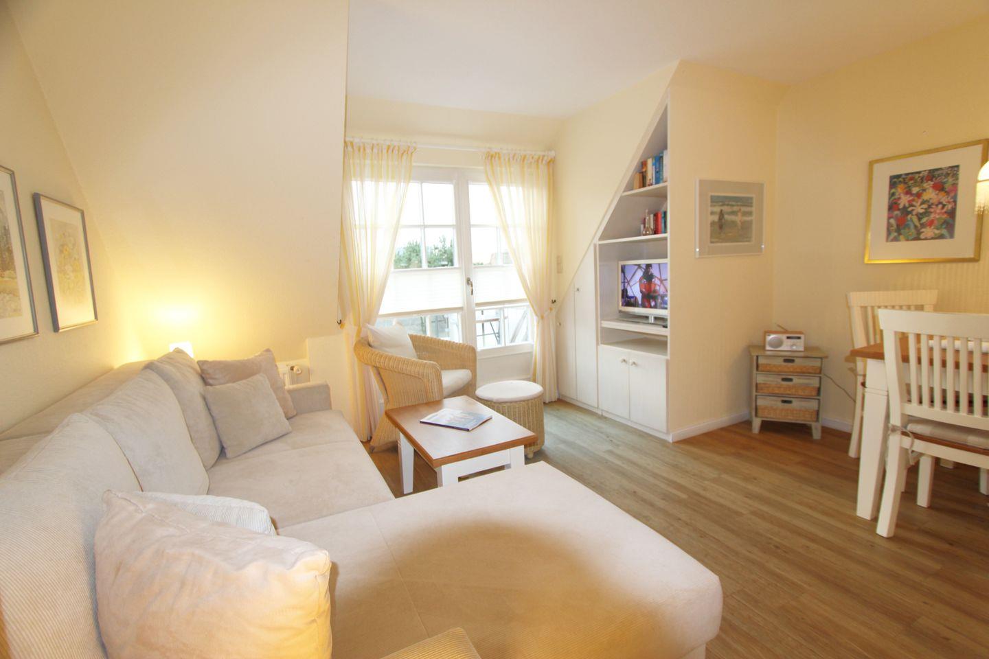 Im Wohnbereich im Obergeschoss genießen Sie durch zwei große Schwenk-Fenster viel Licht und können so auf der bequemen Couch ideal entspannen.