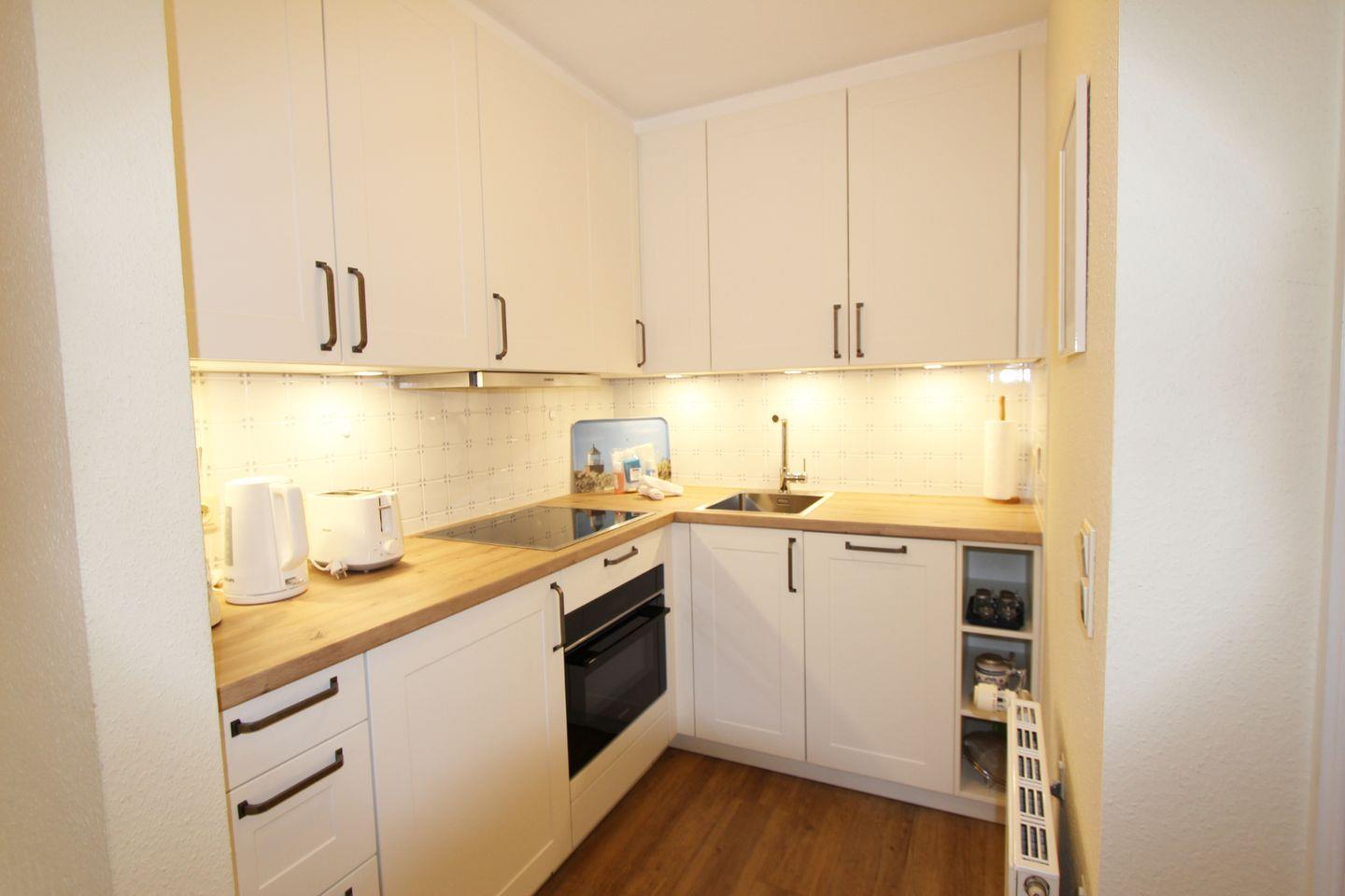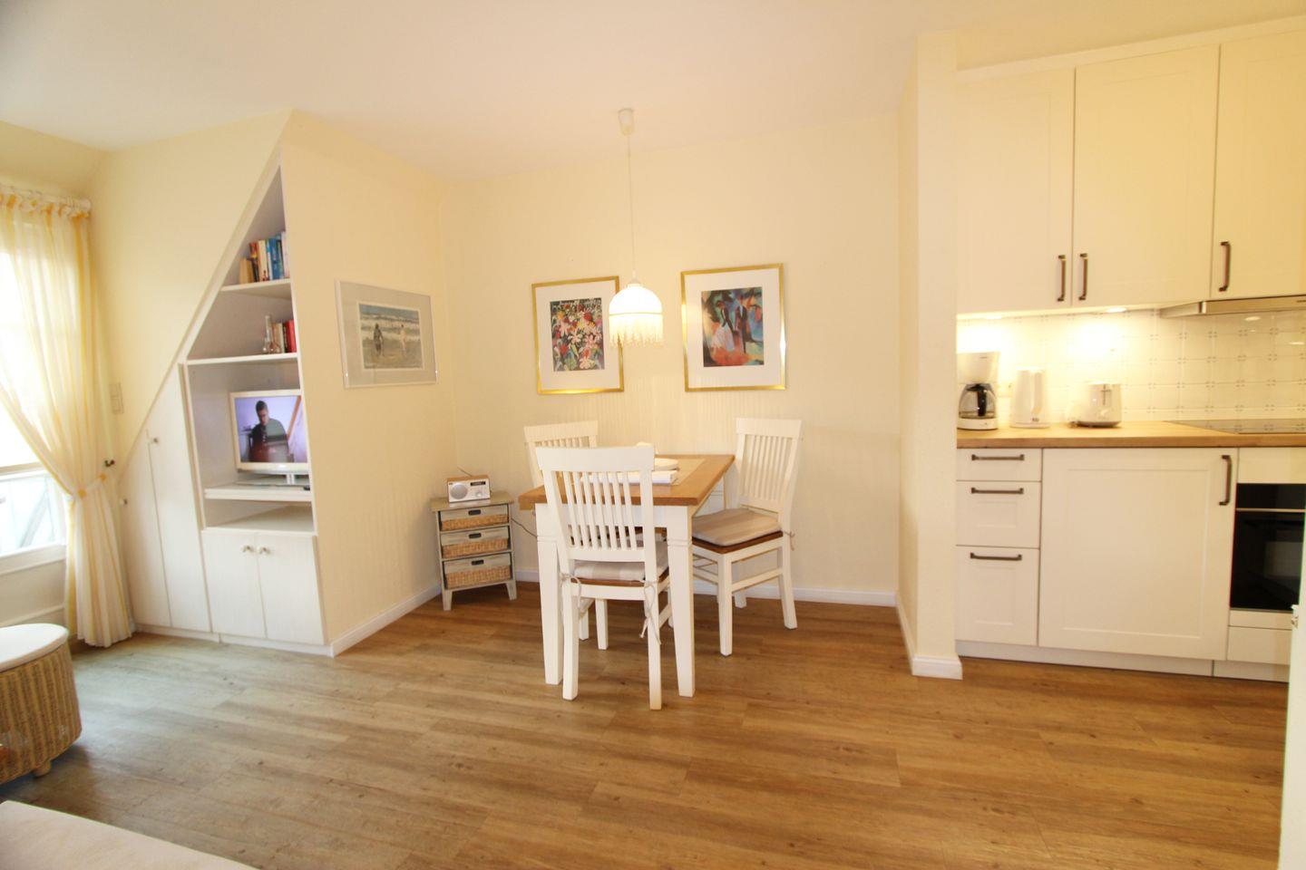Die Kochnische eignet sich hervorragend um sich kulinarisch zu versorgen und um im Anschluss gemeinsam am angrenzenden Esstisch in nordischem Weiß zu speisen.
