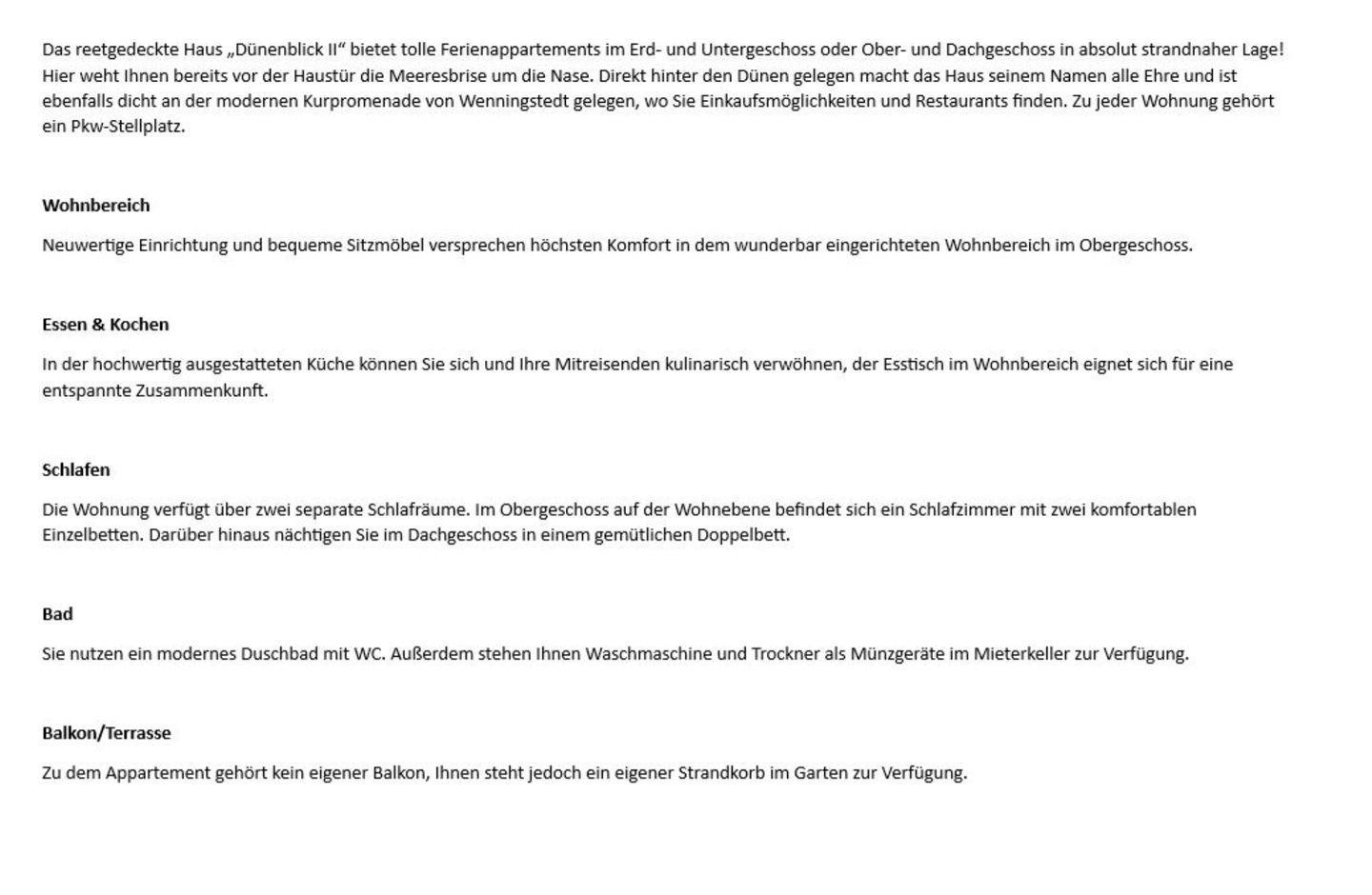 Das reetgedeckte Haus „Dünenblick II“ bietet tolle Ferienappartements im Erd- und Untergeschoss oder Ober- und Dachgeschoss in absolut strandnaher Lage! Hier weht Ihnen bereits vor der Haustür die Meeresbrise um die Nase. Direkt hinter den Dünen gelegen macht das Haus seinem Namen alle Ehre und ist ebenfalls dicht an der modernen Kurpromenade von Wenningstedt gelegen, wo Sie Einkaufsmöglichkeiten und Restaurants finden. Zu jeder Wohnung gehört ein Pkw-Stellplatz.