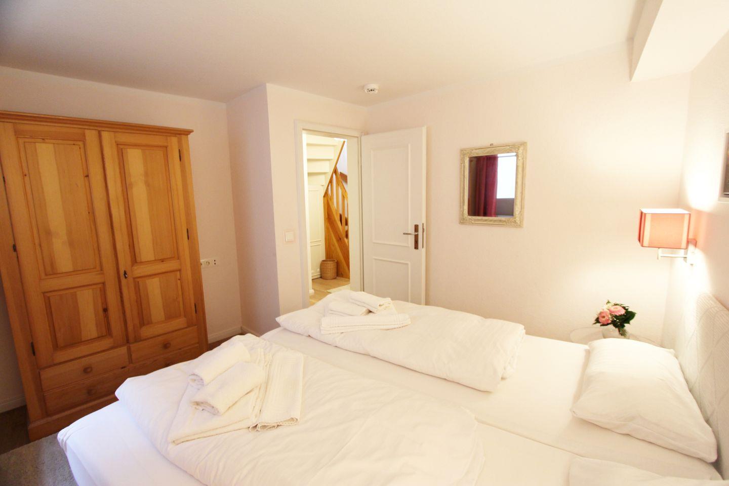 Das Untergeschoss bietet zwei individuell eingerichtete Schlafräume. Im Doppelschlafraum finden Sie ein bequemes Doppelbett mit geräumigem Kleiderschrank vor. Der Einzelschlafraum ist im Stile des Wohnraums hell und nordisch gestaltet.