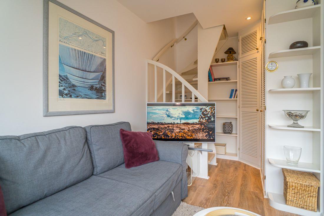 Helles und modernes Wohnzimmer eigerichtet mit LCD Flat TV und Schlafcouch.