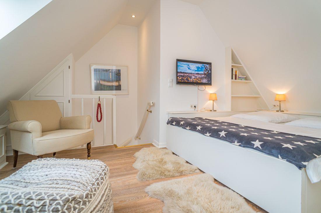 Großes Schlafzimmer mit Doppelbett und LCD-Flat TV.