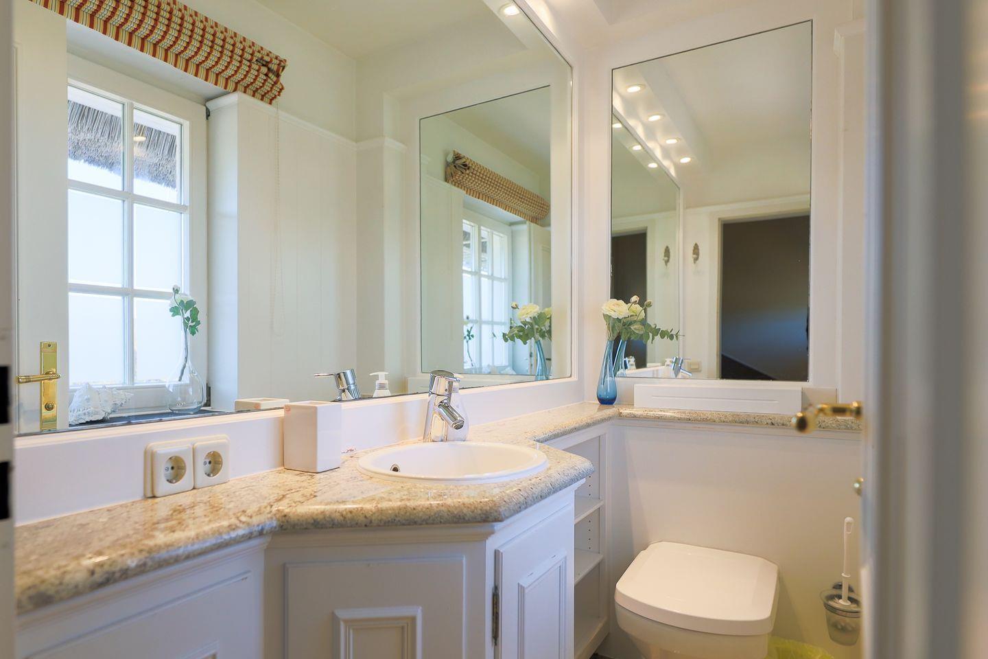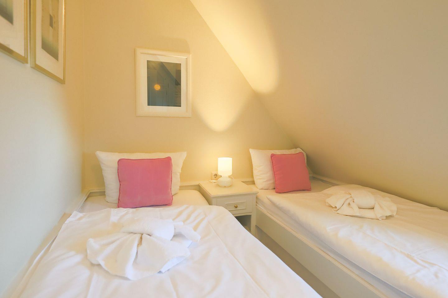 Eine Treppe höher befinden sich ein Schlafzimmer mit gemütlichem Doppelbett, ein Schlafzimmer mit zwei Einzelbetten sowie das in Marmor gehaltene Duschbad. Alles in allem ein perfektes Familiennest zum Wohlfühlen!
