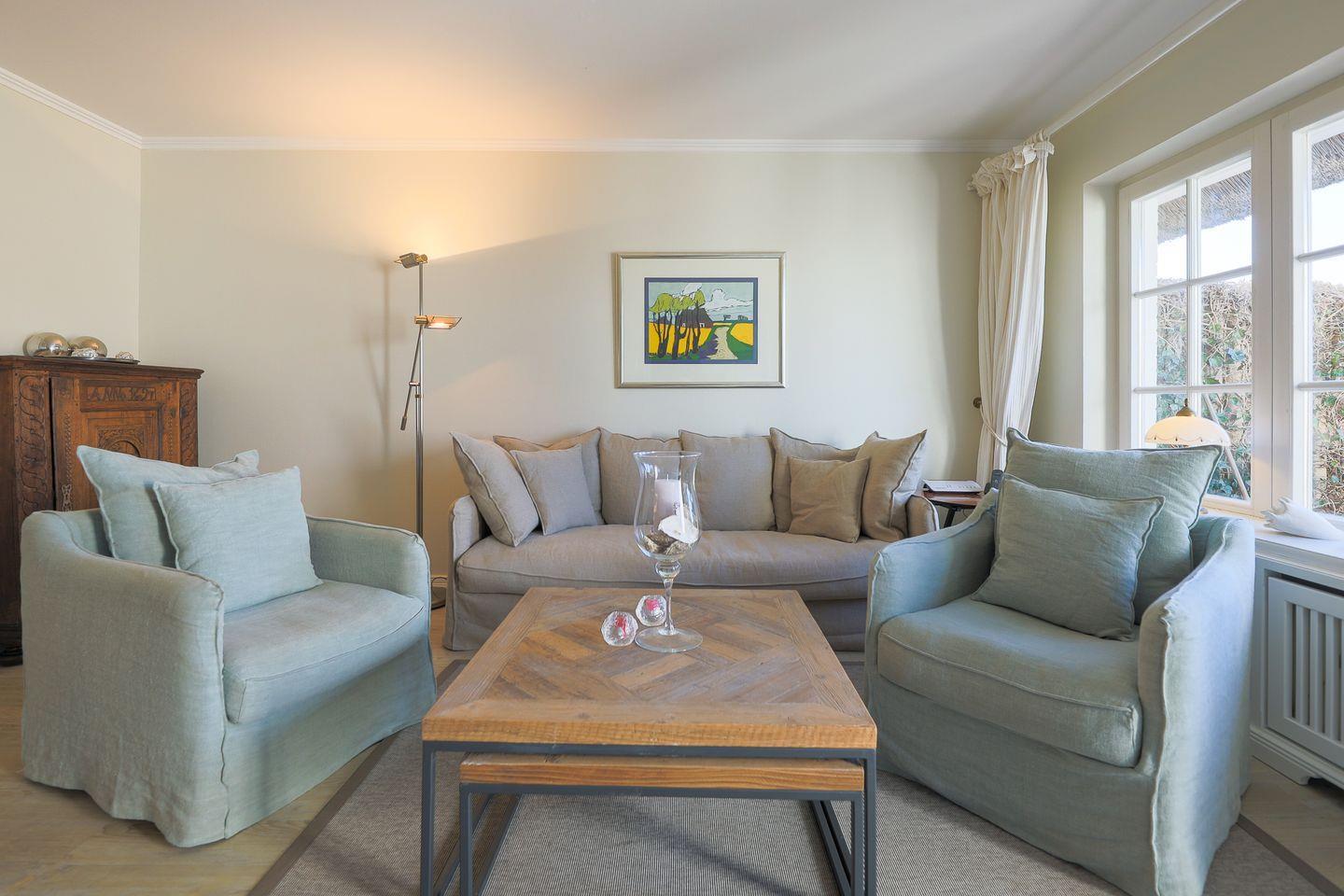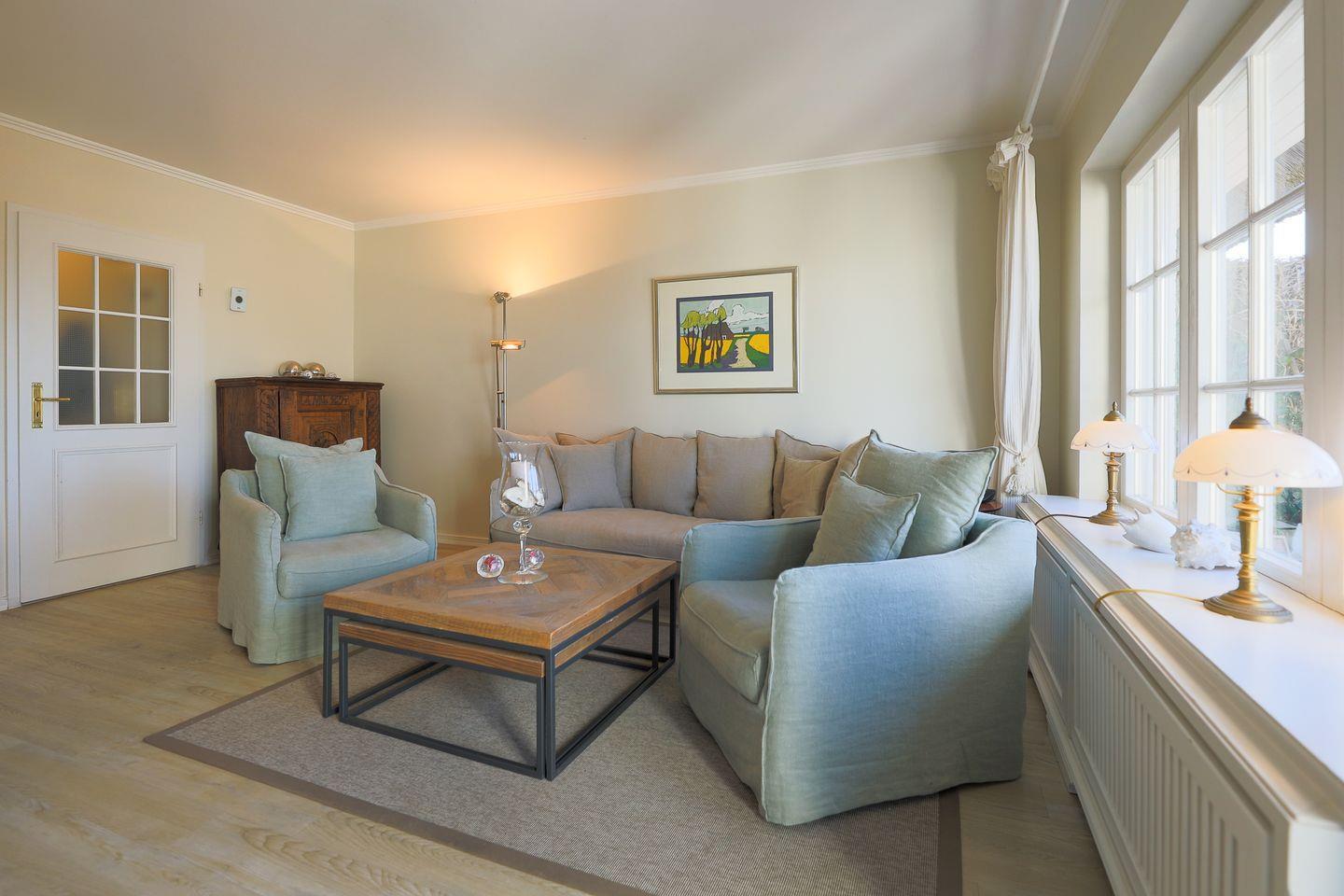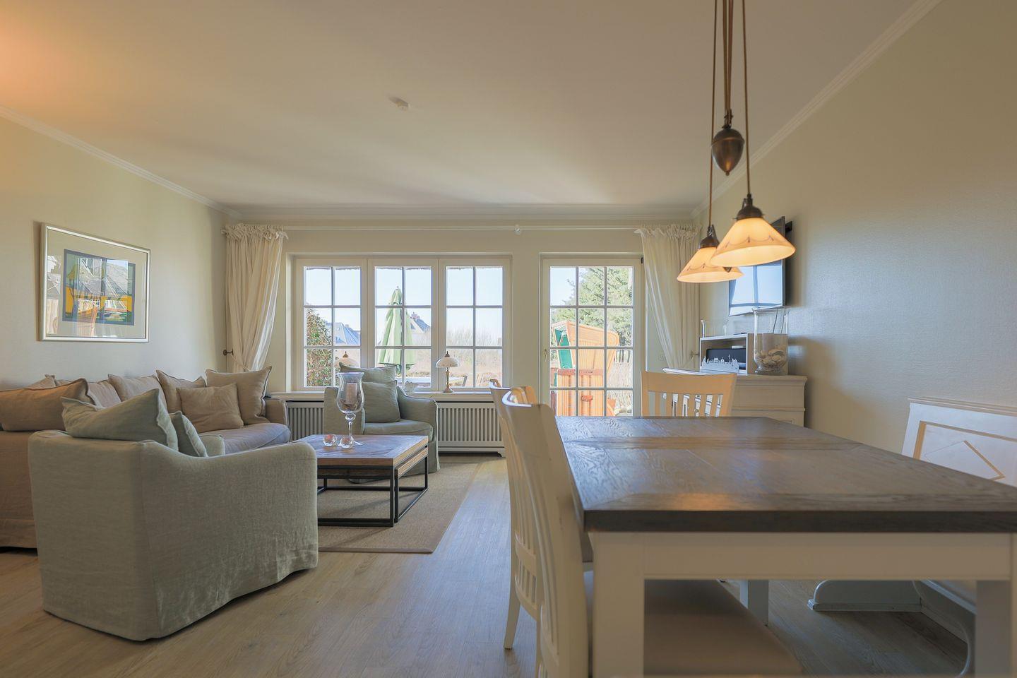 Das im friesischen Landhaus-Stil gehaltene Hausteil erstreckt sich über zwei Ebenen. Im Erdgeschoss lädt der hochwertig möblierte Wohnraum samt offener Küche zum Entspannen und gemütlichem Beisammensein ein. Highlight ist die Süd-West Terrasse mit ihrem herrlichen Ausblick in die naturgeschützte Heide. Ein kleines Gäste-WC befindet sich ebenfalls im Ergeschoss.