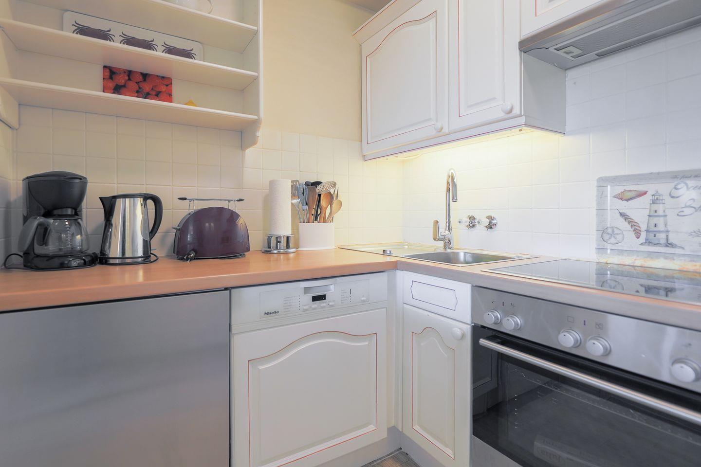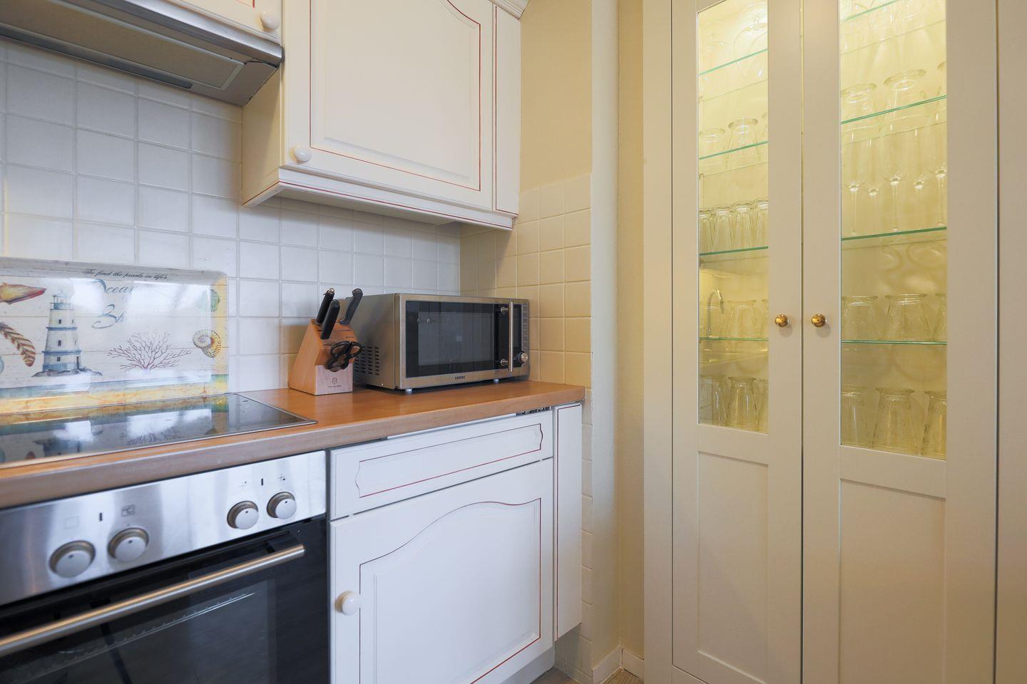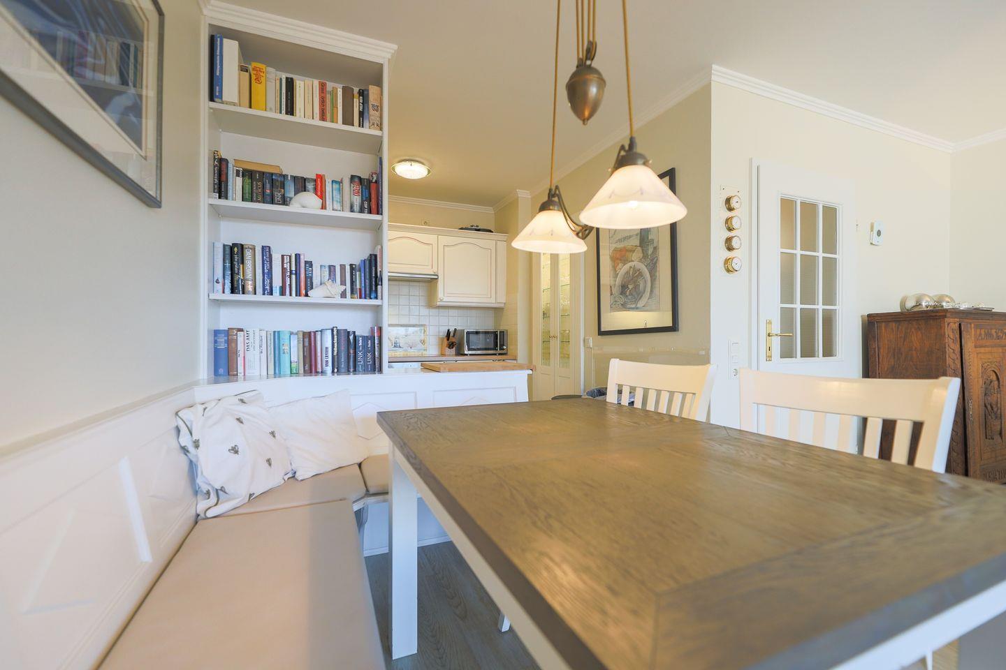 Das im friesischen Landhaus-Stil gehaltene Hausteil erstreckt sich über zwei Ebenen. Im Erdgeschoss lädt der hochwertig möblierte Wohnraum samt offener Küche zum Entspannen und gemütlichem Beisammensein ein. Highlight ist die Süd-West Terrasse mit ihrem herrlichen Ausblick in die naturgeschützte Heide. Ein kleines Gäste-WC befindet sich ebenfalls im Ergeschoss.