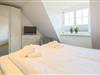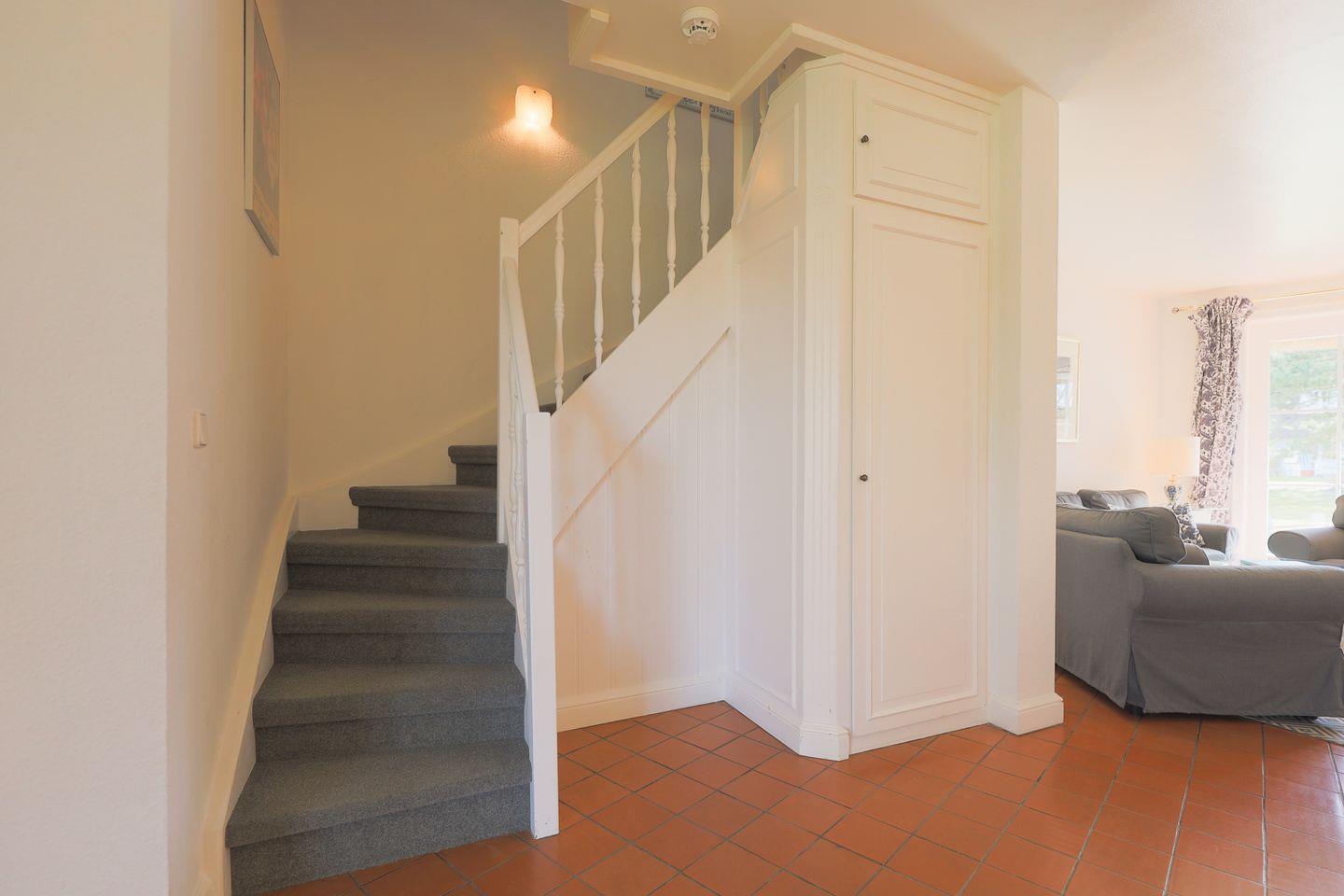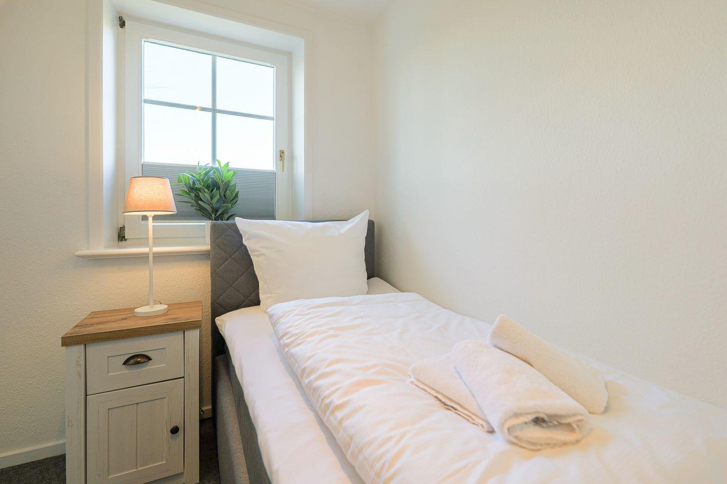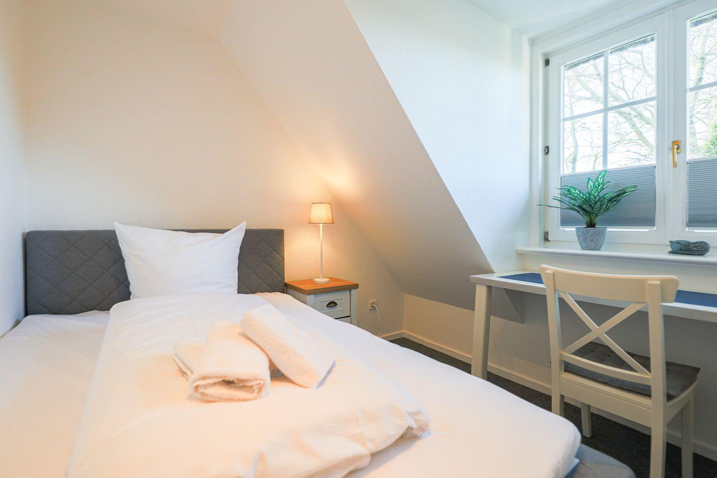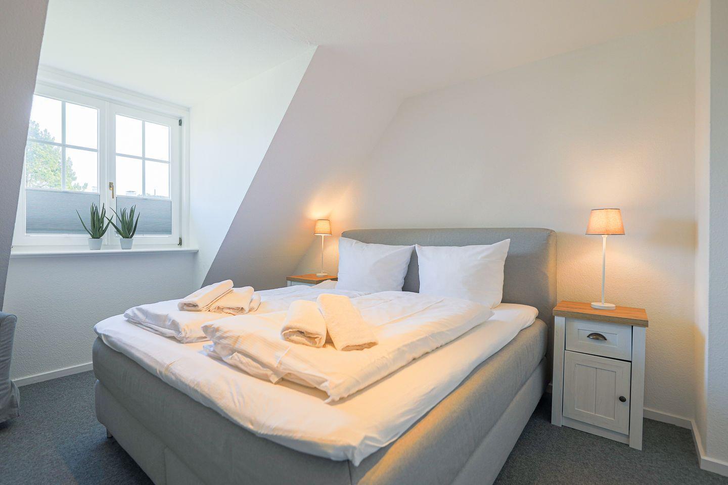 Das Erdgeschoss umfasst einen geräumigen Wohnbereich mit "Sofa-Ecke", hellen Einbauten, einem kleinen Kamin sowie einen Esstisch. Die moderne Küche bietet alles, was das Herz eines Koches begehrt. Besonders schön: Die kleine Gartenterrasse mit Strandkorb, der bei schönem Wetter zum draußen sitzen einlädt. Ebenfalls im Untergeschoss befindet sich auch noch ein kleines Gäste-WC. Eine Treppe höher, im Obergeschoss des Hauses befinden sich drei Schlafzimmer mit komfortablen Boxspringbetten (1x Doppelbett 1,80m, 1x Doppelbett 1,60m, 1x Einzelbett 90cm) sowie ein großes Duschbad.