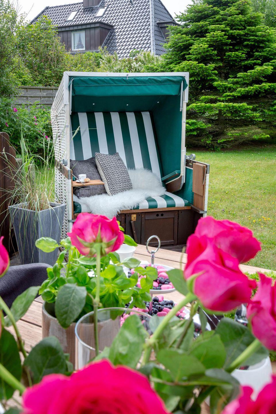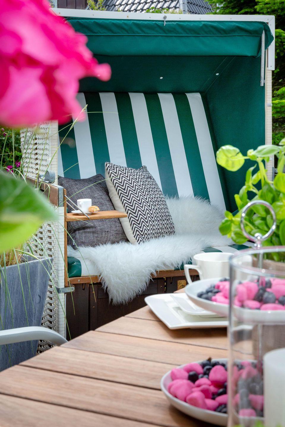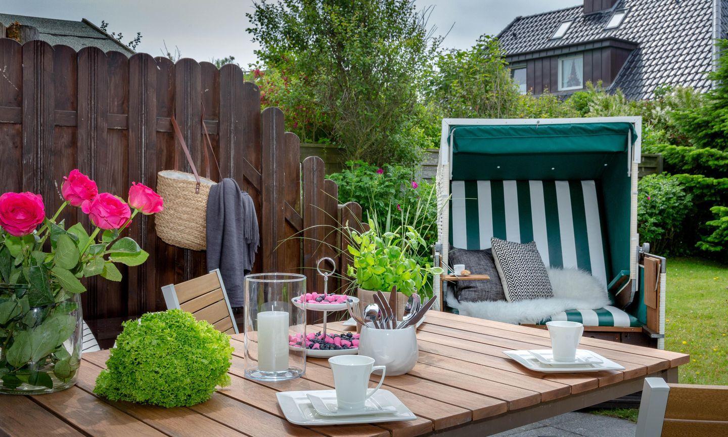Das Herzstück bildet der lichtdurchflutete Wohnraum, der mit seiner großen Fensterfront den Blick auf die windgeschützte Süd-Terrasse freigibt, welche von morgens bis abends in der Sonne liegt. Der originale Sylter Strandkorb lädt an kühlen Tagen zum Sonnenbad ein.