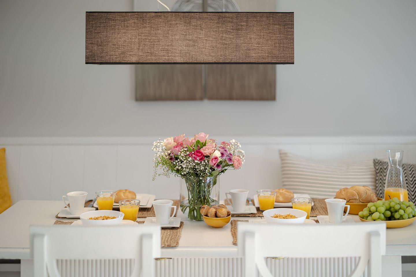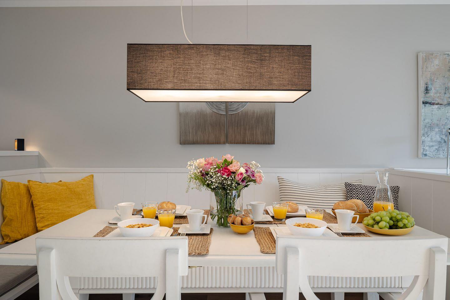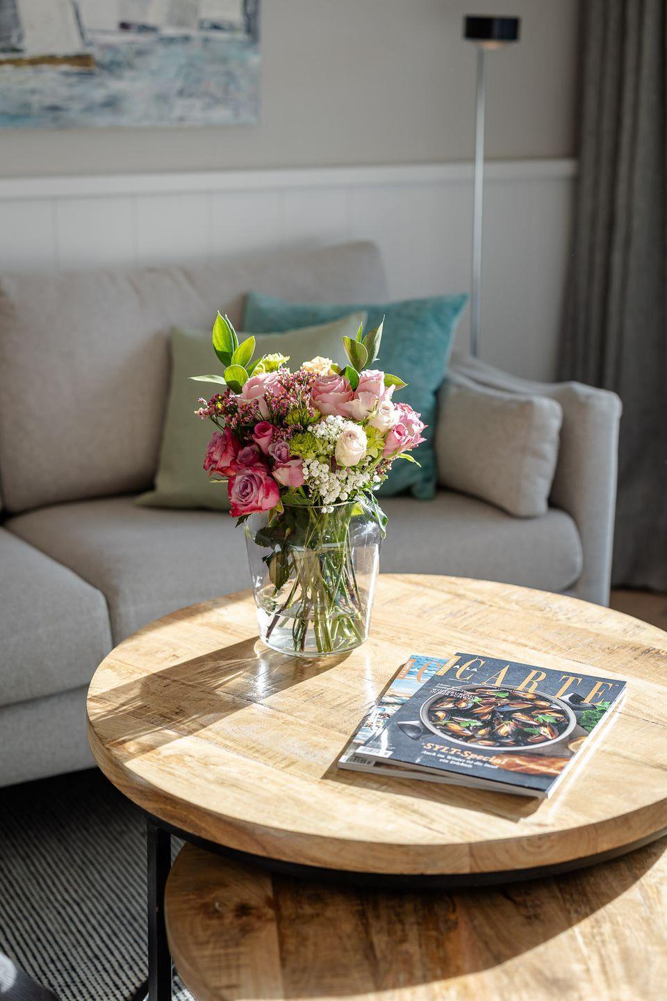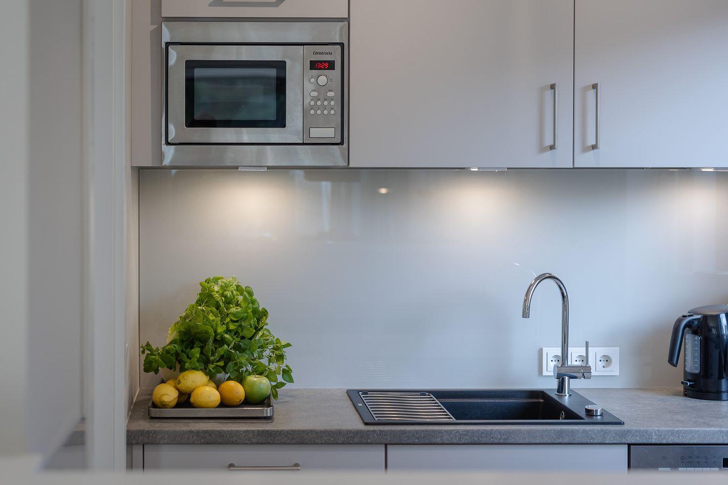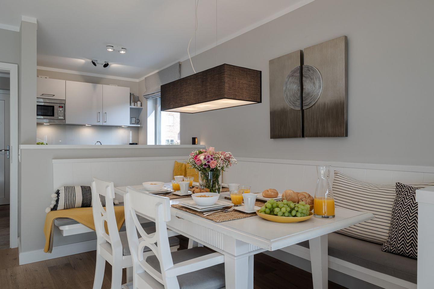 Im Wohnbereich, der durch sein helles Eichenparkett Behaglichkeit ausstrahlt, können Sie auf gemütlichen Sofa-Elementen die Seele baumeln lassen und auf dem Smart TV Ihre Lieblingsfilme über Netflix & Co schauen, oder am stilvollen Esstisch gesellige Stunden verbringen. Hier grenzt zudem die offene Küche an, sodass das Kochen zum gemeinsamen Erlebnis werden kann. Durch die hochwertige Ausstattung wird die Selbstversorgung für Sie zum Vergnügen.