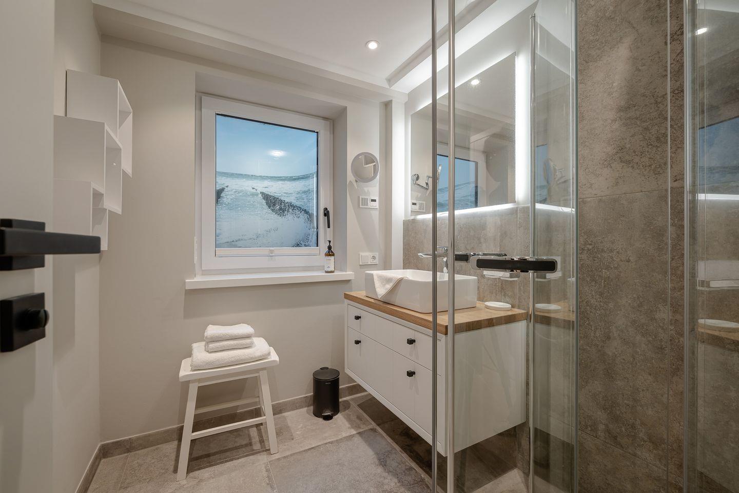 Im Souterrain befindet sich das große Badezimmer mit bodentiefer Dusche. Die exklusive Gestaltung des Badezimmers verströmt eine Wohlfühlatmosphäre und trägt so zu Ihrer Entspannung bei.