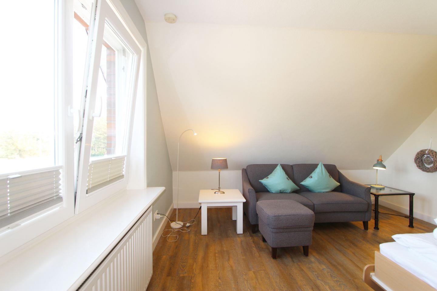 Im Wohnbereich im Obergeschoss steht Ihnen eine bequeme Sofagarnitur zur Verfügung, auf der Sie sich ausgiebig entspannen können.