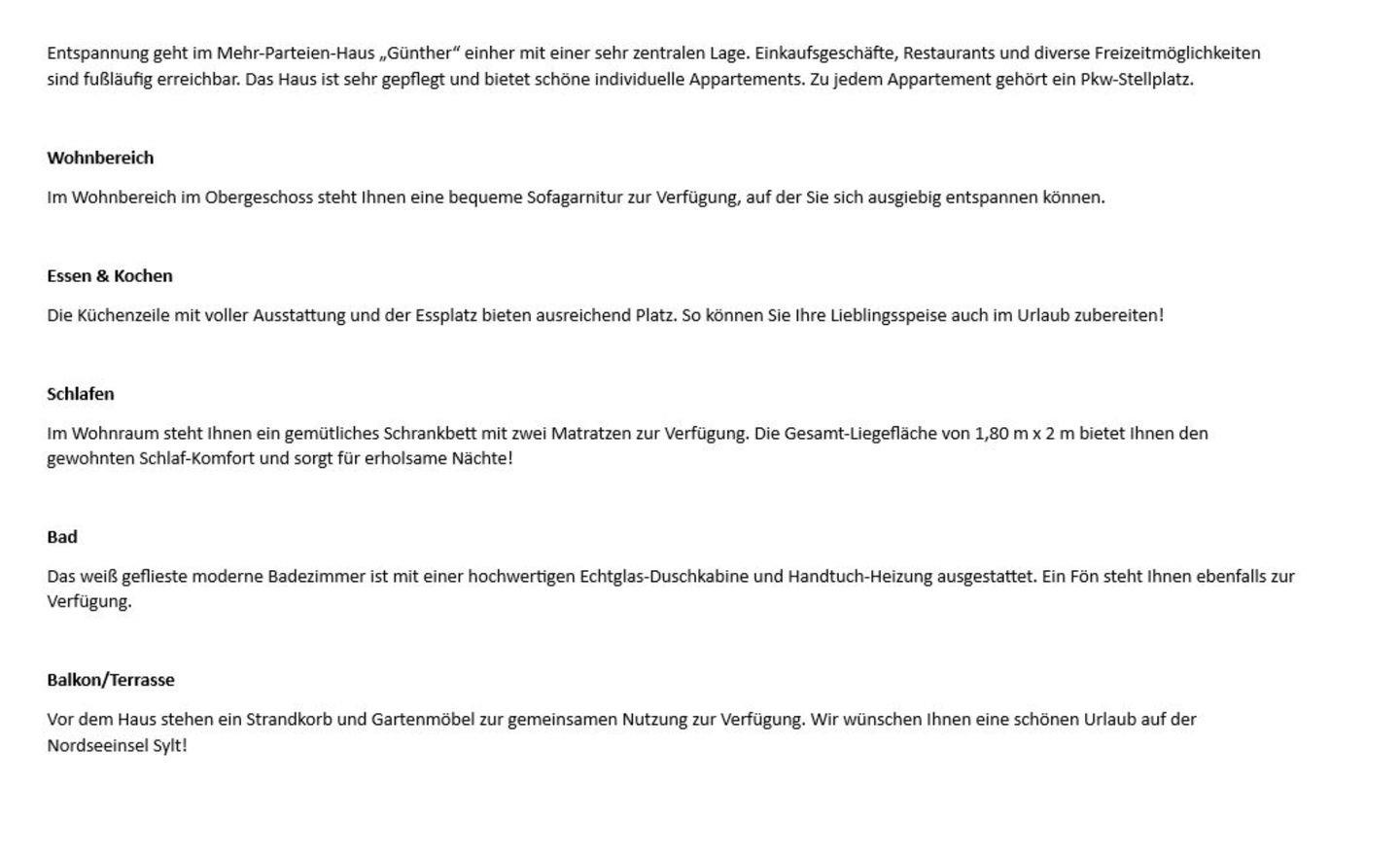 Entspannung geht im Mehr-Parteien-Haus „Günther“ einher mit einer sehr zentralen Lage. Einkaufsgeschäfte, Restaurants und diverse Freizeitmöglichkeiten sind fußläufig erreichbar. Das Haus ist sehr gepflegt und bietet schöne individuelle Appartements. Zu jedem Appartement gehört ein Pkw-Stellplatz.