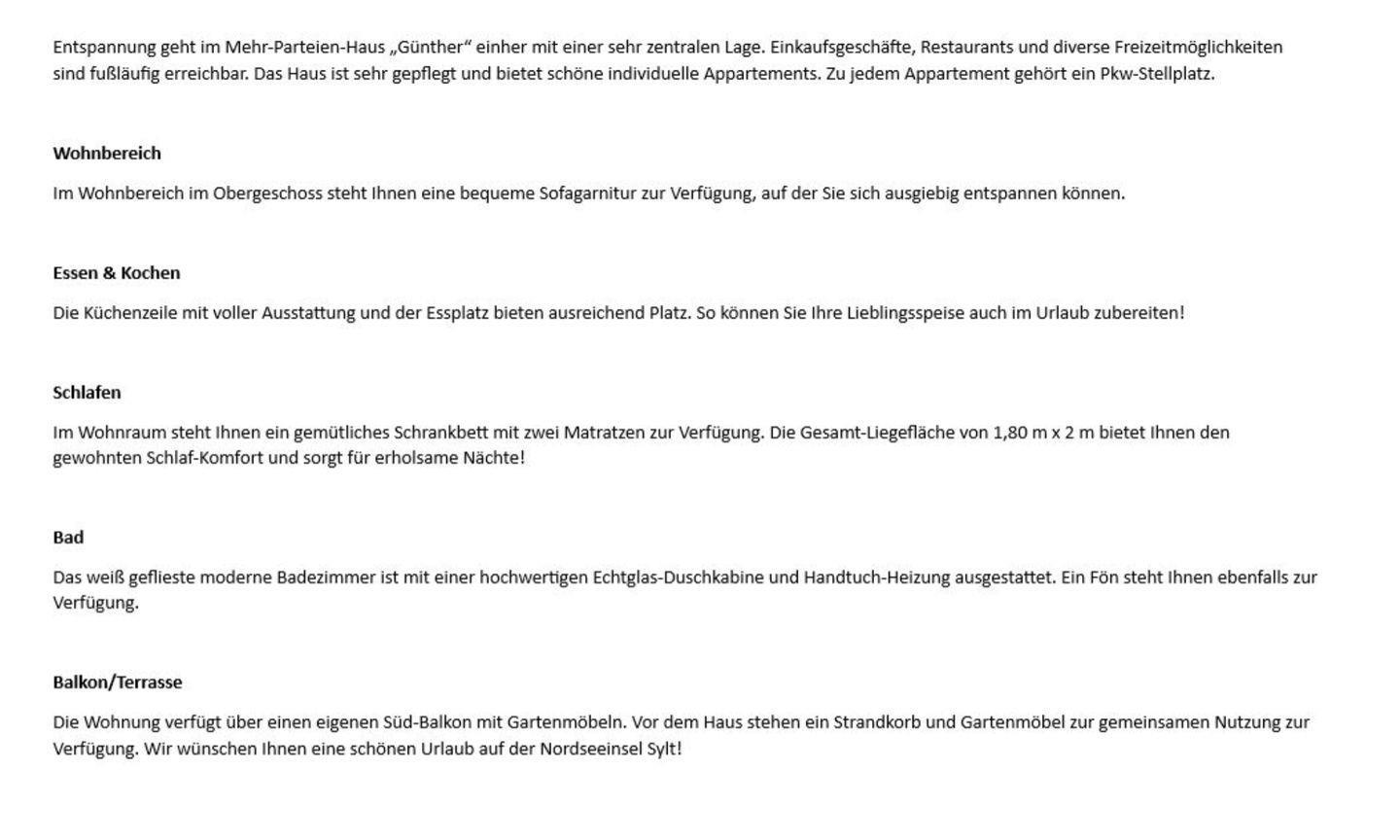 Die Wohnung verfügt über einen eigenen Süd-Balkon mit Gartenmöbeln. Vor dem Haus stehen ein Strandkorb und Gartenmöbel zur gemeinsamen Nutzung zur Verfügung. Wir wünschen Ihnen eine schönen Urlaub auf der Nordseeinsel Sylt!