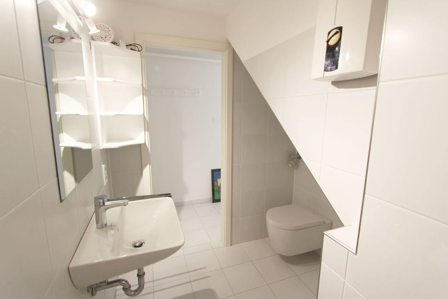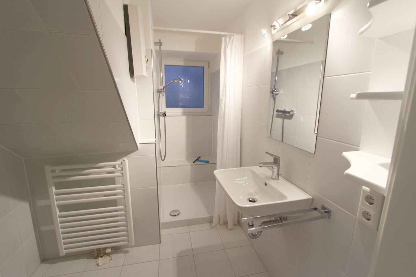 Im weiß gefliesten modernen Badezimmer nutzen Sie Dusche und WC und können sich für den Urlaubstag erfrischen. Eine Waschmaschine steht als Münzgerät im Mieterkeller zur Verfügung.