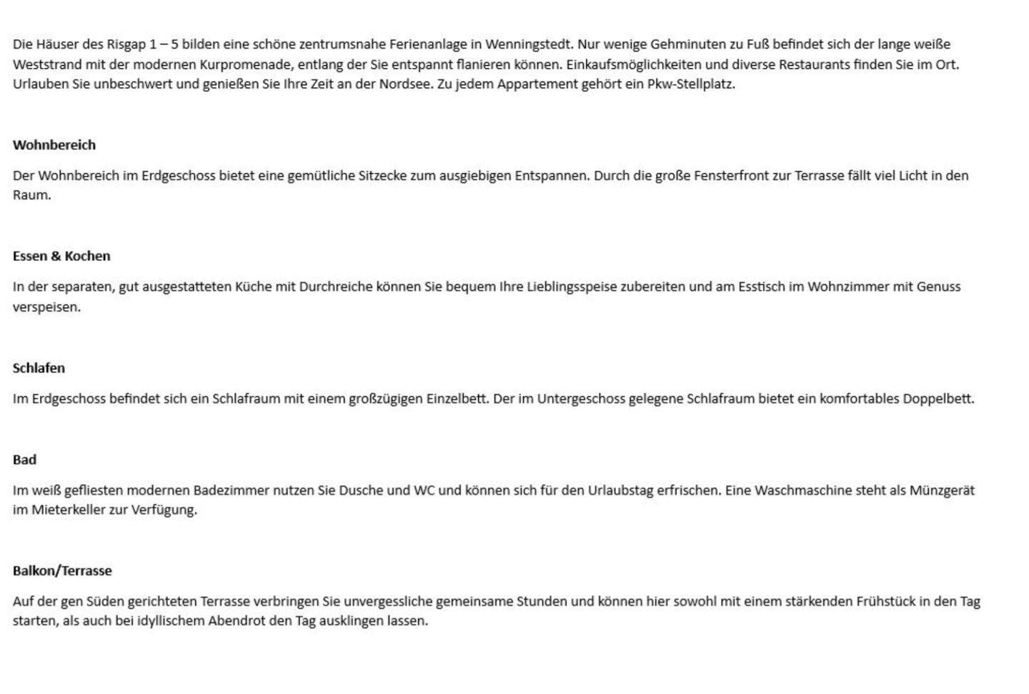 Die Häuser des Risgap 1 – 5 bilden eine schöne zentrumsnahe Ferienanlage in Wenningstedt. Nur wenige Gehminuten zu Fuß befindet sich der lange weiße Weststrand mit der modernen Kurpromenade, entlang der Sie entspannt flanieren können. Einkaufsmöglichkeiten und diverse Restaurants finden Sie im Ort. Urlauben Sie unbeschwert und genießen Sie Ihre Zeit an der Nordsee. Zu jedem Appartement gehört ein Pkw-Stellplatz.