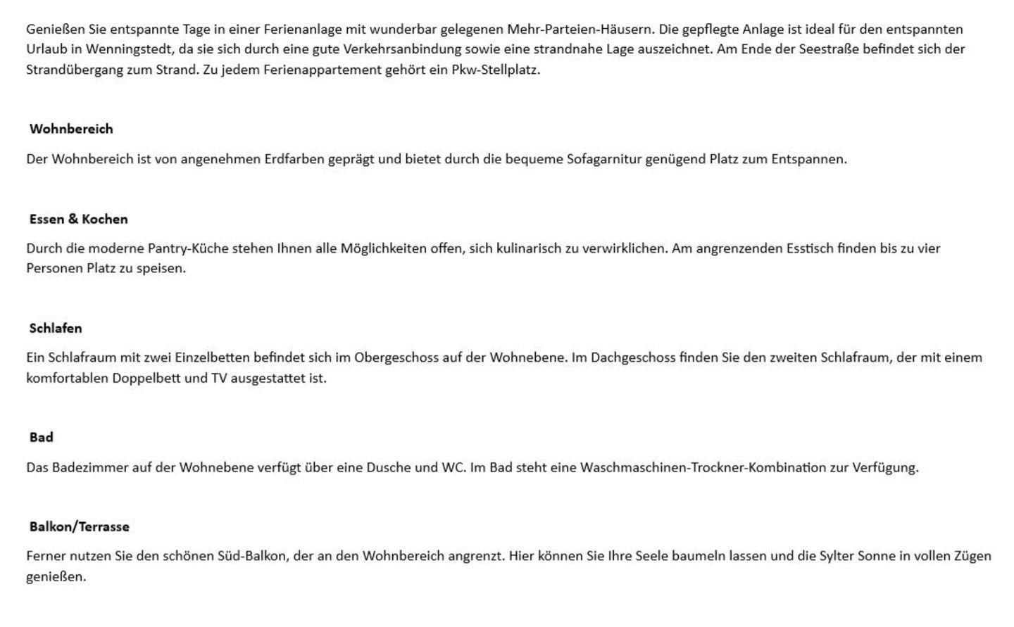Genießen Sie entspannte Tage in einer Ferienanlage mit wunderbar gelegenen Mehr-Parteien-Häusern. Die gepflegte Anlage ist ideal für den entspannten Urlaub in Wenningstedt, da sie sich durch eine gute Verkehrsanbindung sowie eine strandnahe Lage auszeichnet. Am Ende der Seestraße befindet sich der Strandübergang zum Strand. Zu jedem Ferienappartement gehört ein Pkw-Stellplatz.